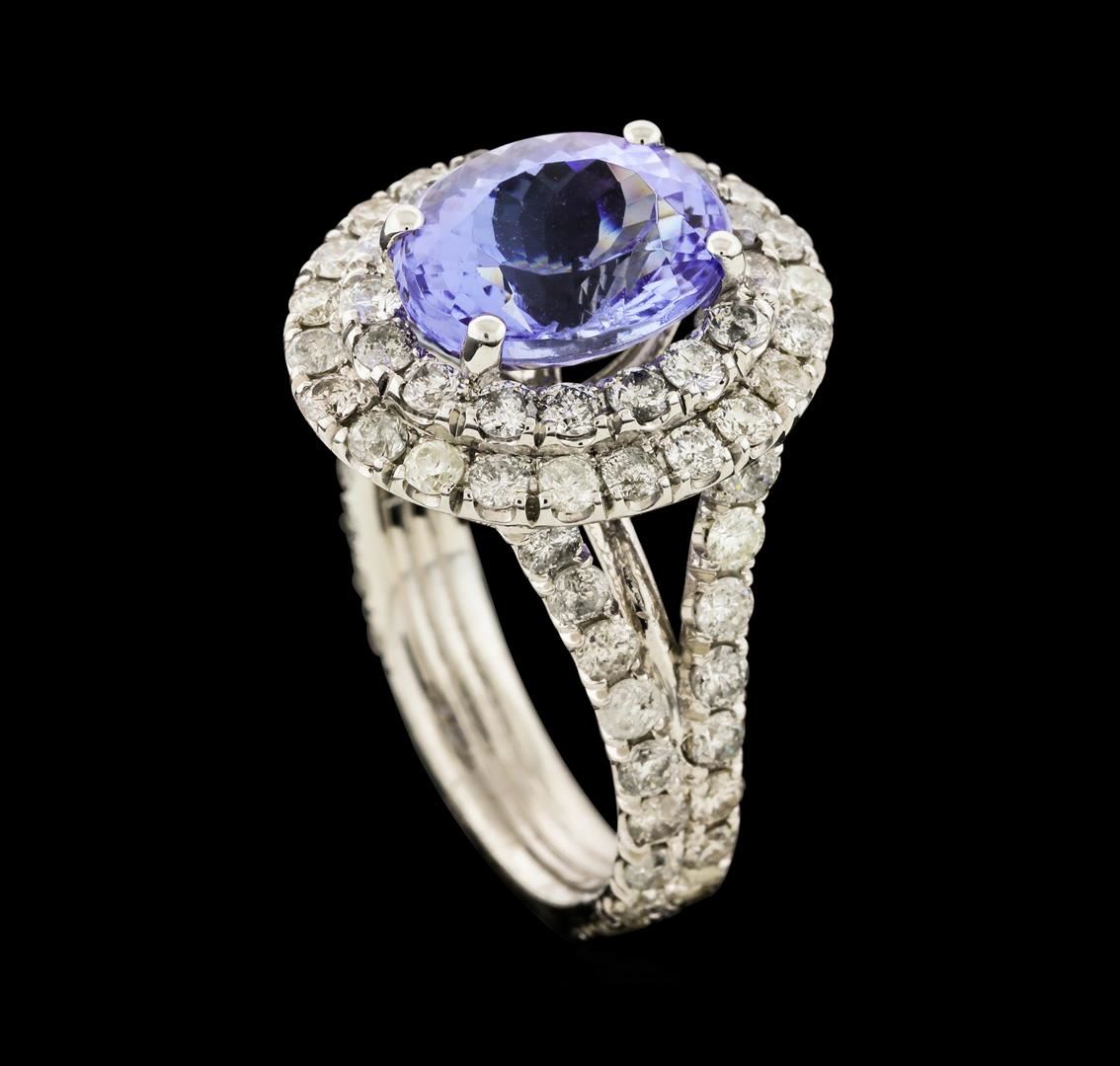 One electronically tested 14KT white gold lady's cast fashion ring with a split shank double basket halo with a bright polish finish. The featured lady's ring has a double shank measuring 4.00 millimeters wide. Identified with markings of '14K'. Condition is new, good workmanship. Containing: One prong set oval modified brilliant cut natural tanzanite, measuring 10.97 x 9.05 x 6.70mm, (depth est.) approximate weight of 4.44ct., clarity is eye clean, medium light, slightly grayish, violet color, (GIA V 4/2), cut is very good. Transmitting light with no distortion, transparent. Colored gemstones are presumed to have been subjected to commonly used enhancement processes. Graded in the setting. Seventy-Eight prong set round brilliant cut diamonds, measuring 2.20 - 1.90 x 1.27mm (depth est.) approximate total weight of 78 Stones = 2.58ct. Graded in the setting. Clarity SI-2 to I-1. Color: H - I Cut Good. Total Weight of Colored Stones 4.44ct.. Total Weight of Diamonds 2.58ct.. Total Weight of Ring 7.50gm. GAS Appraised at $8,120.00.