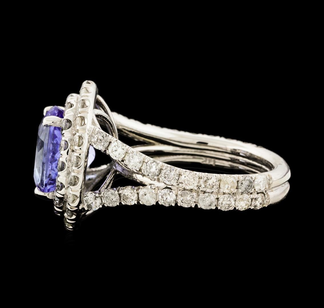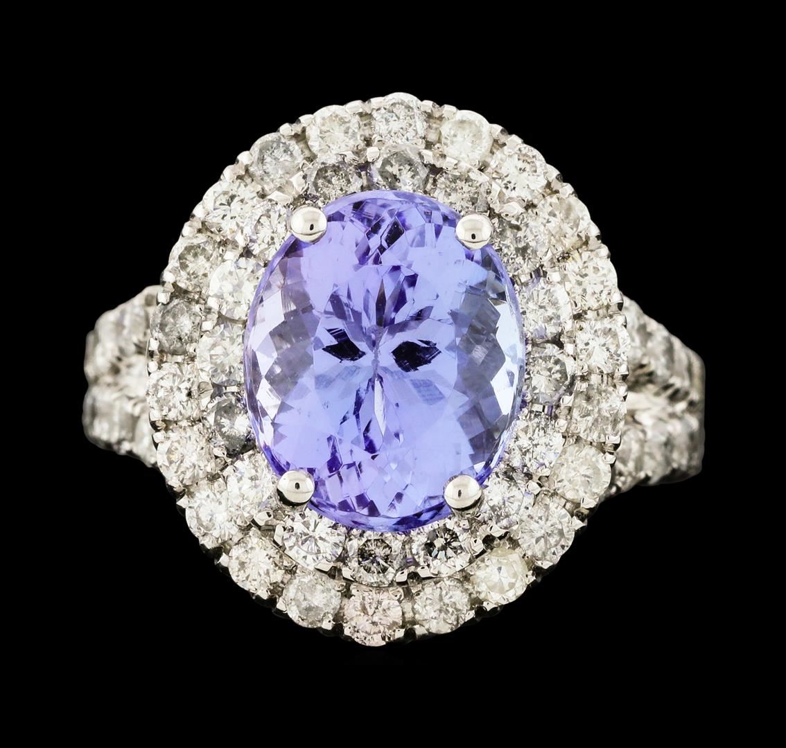 One electronically tested 14KT white gold lady's cast fashion ring with a split shank double basket halo with a bright polish finish. The featured lady's ring has a double shank measuring 4.00 millimeters wide. Identified with markings of '14K'. Condition is new, good workmanship. Containing: One prong set oval modified brilliant cut natural tanzanite, measuring 10.97 x 9.05 x 6.70mm, (depth est.) approximate weight of 4.44ct., clarity is eye clean, medium light, slightly grayish, violet color, (GIA V 4/2), cut is very good. Transmitting light with no distortion, transparent. Colored gemstones are presumed to have been subjected to commonly used enhancement processes. Graded in the setting. Seventy-Eight prong set round brilliant cut diamonds, measuring 2.20 - 1.90 x 1.27mm (depth est.) approximate total weight of 78 Stones = 2.58ct. Graded in the setting. Clarity SI-2 to I-1. Color: H - I Cut Good. Total Weight of Colored Stones 4.44ct.. Total Weight of Diamonds 2.58ct.. Total Weight of Ring 7.50gm. GAS Appraised at $8,120.00.