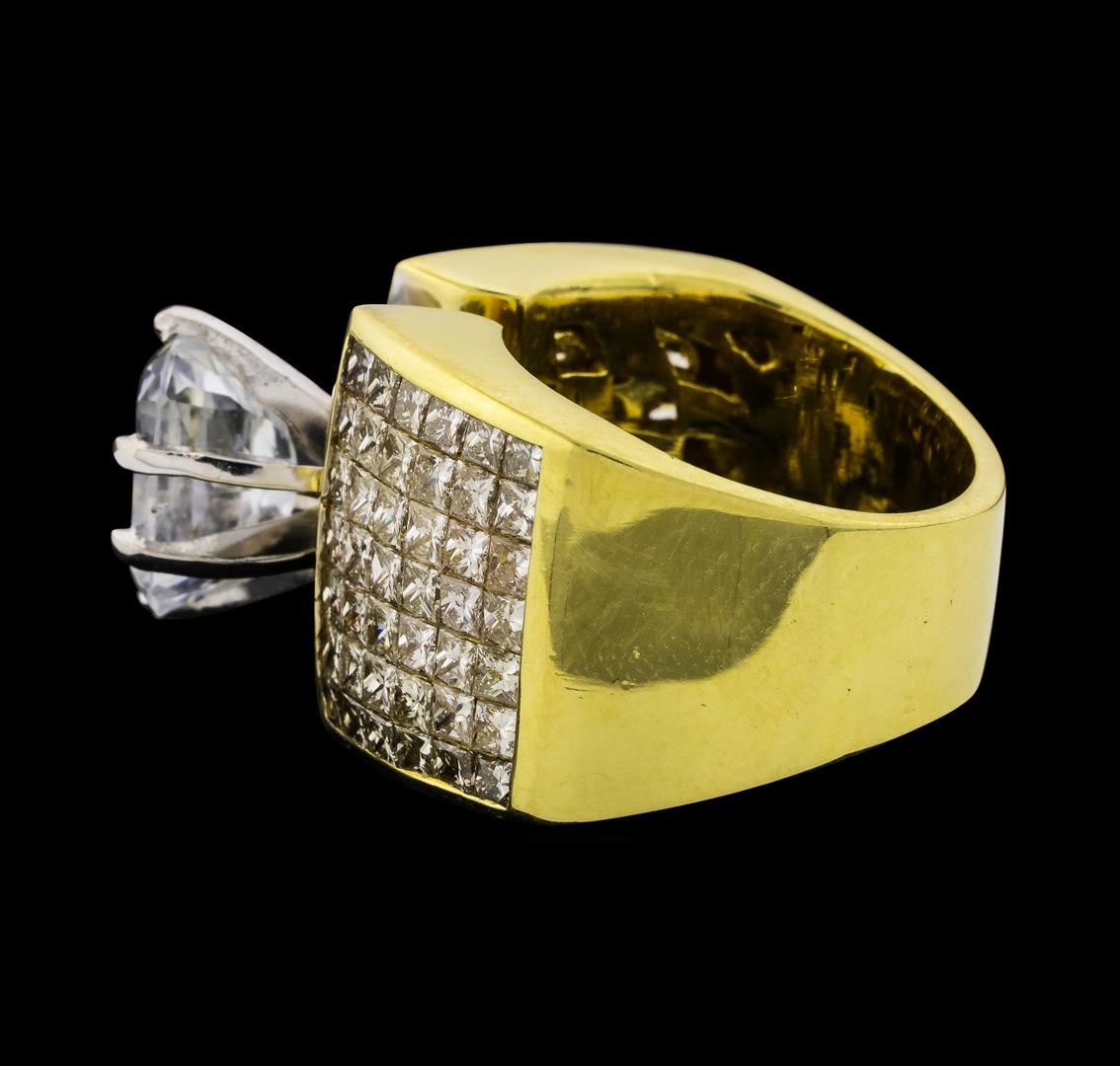 One 18KT Yellow and White Gold Ring with a total weight of 24.00 grams. Containing: Main Gemstones: Identity: Natural White Sapphire. Carat Weight: 4.44 cts tw. Shape & Measurement: Radiant Cut. Quality: Natural Color, No Heated. Fine Cutting. Adjacent Gemstones: Identity: Natural Diamond. Shape: Princess Cut. Carat Weight: 5.88 cts tw. Quality: SI-VS Clarity, H-I Color. All Fine cutting and proportions. Total Gemstones weight: 10.32 cts tw. RBGS Appraised at $26,000.00.