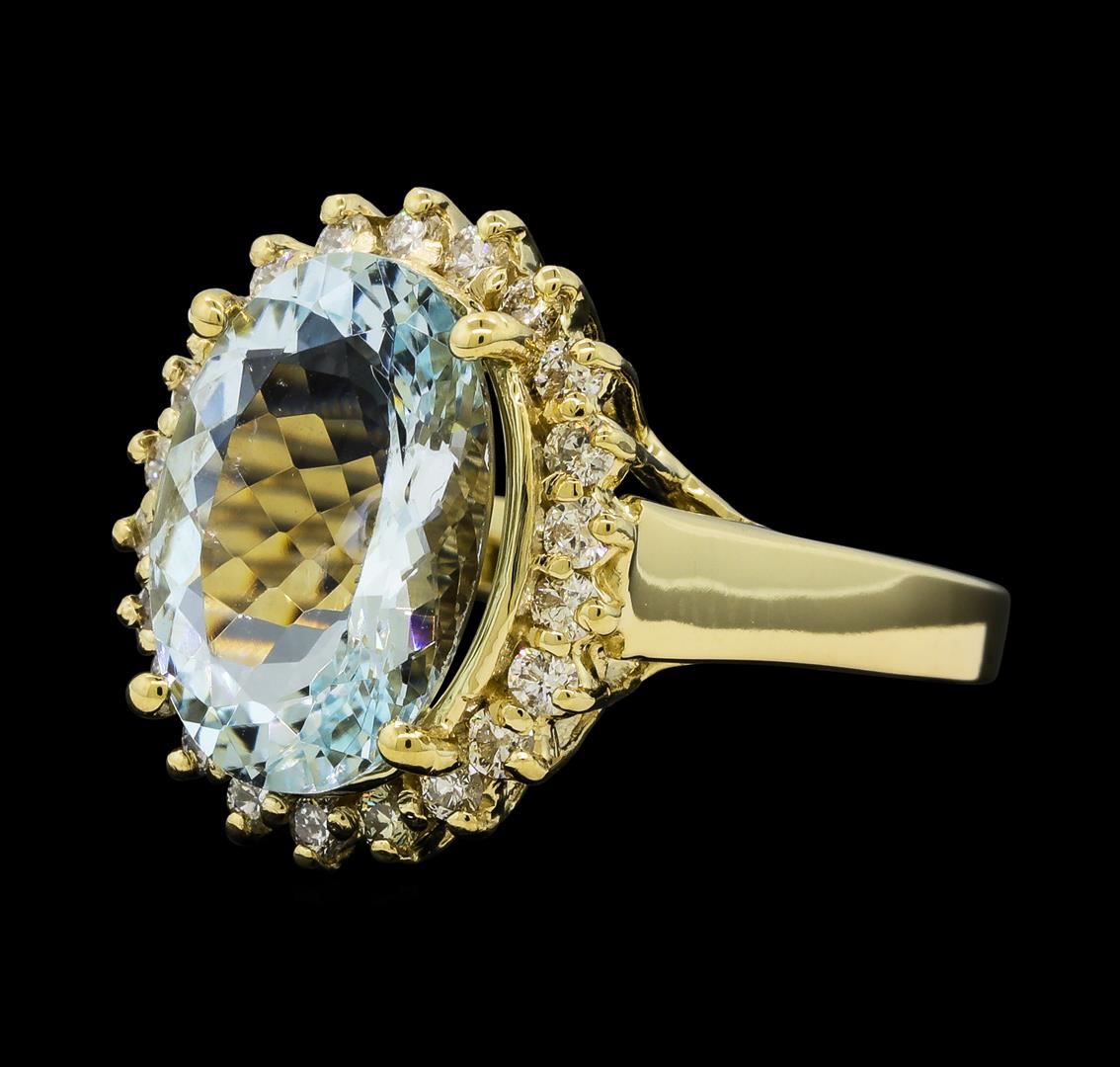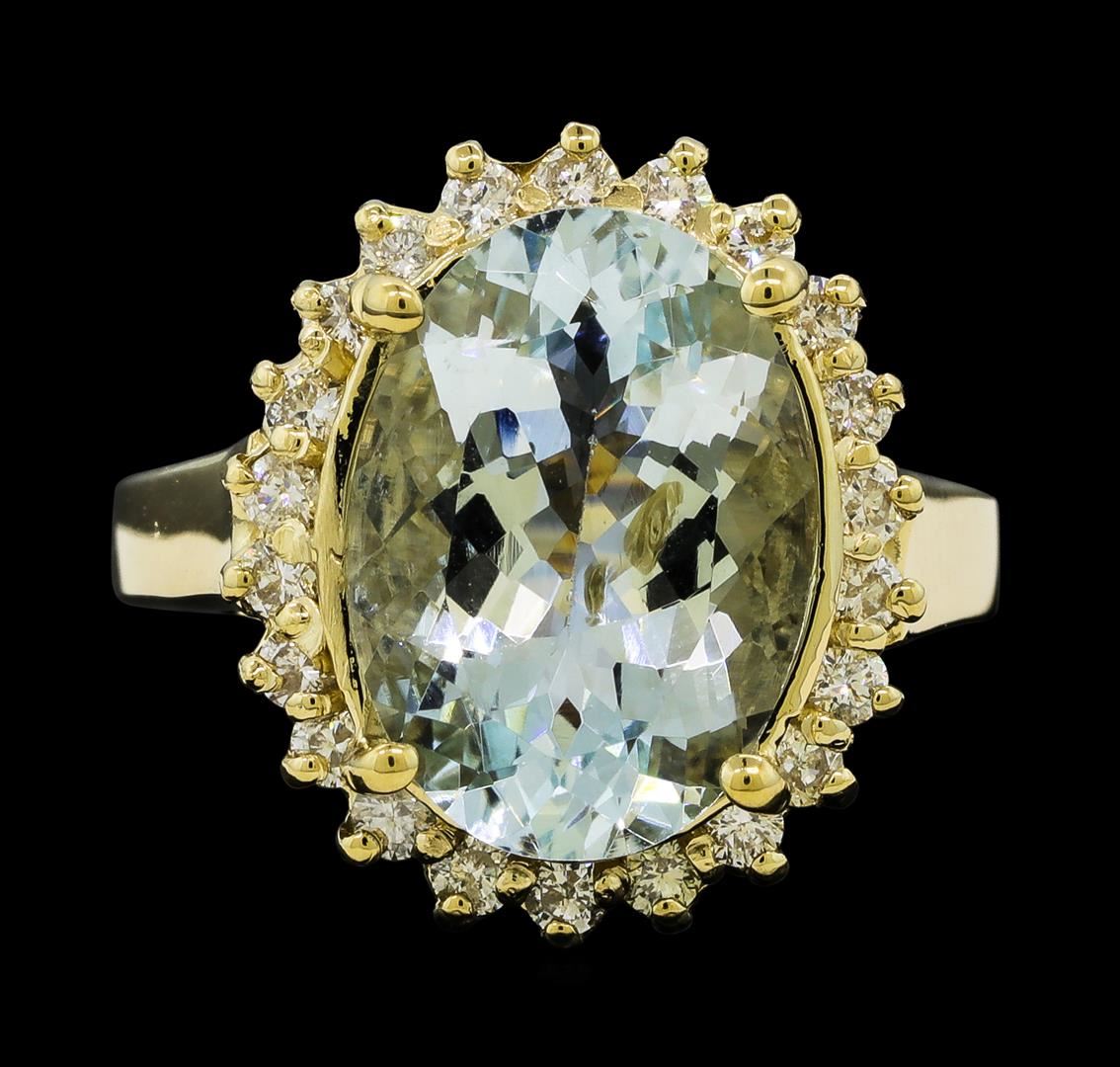 One Aquamarine and Diamond Ring including: 14KT Yellow Gold weighing a total of 6.60 grams, Aquamarine weighing a total of 4.45ct, and 22 Diamonds weighing a total of 0.54ctw.
