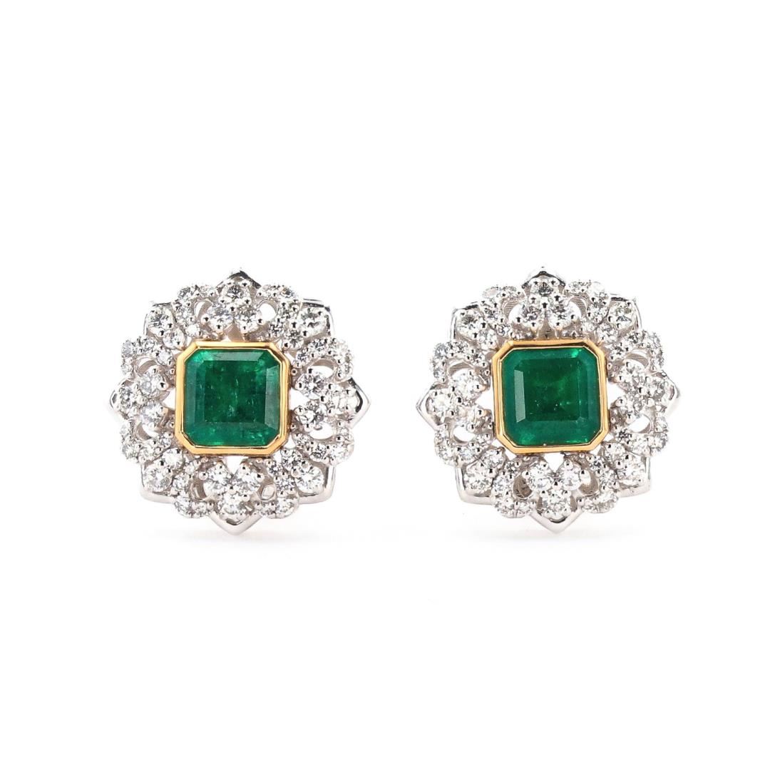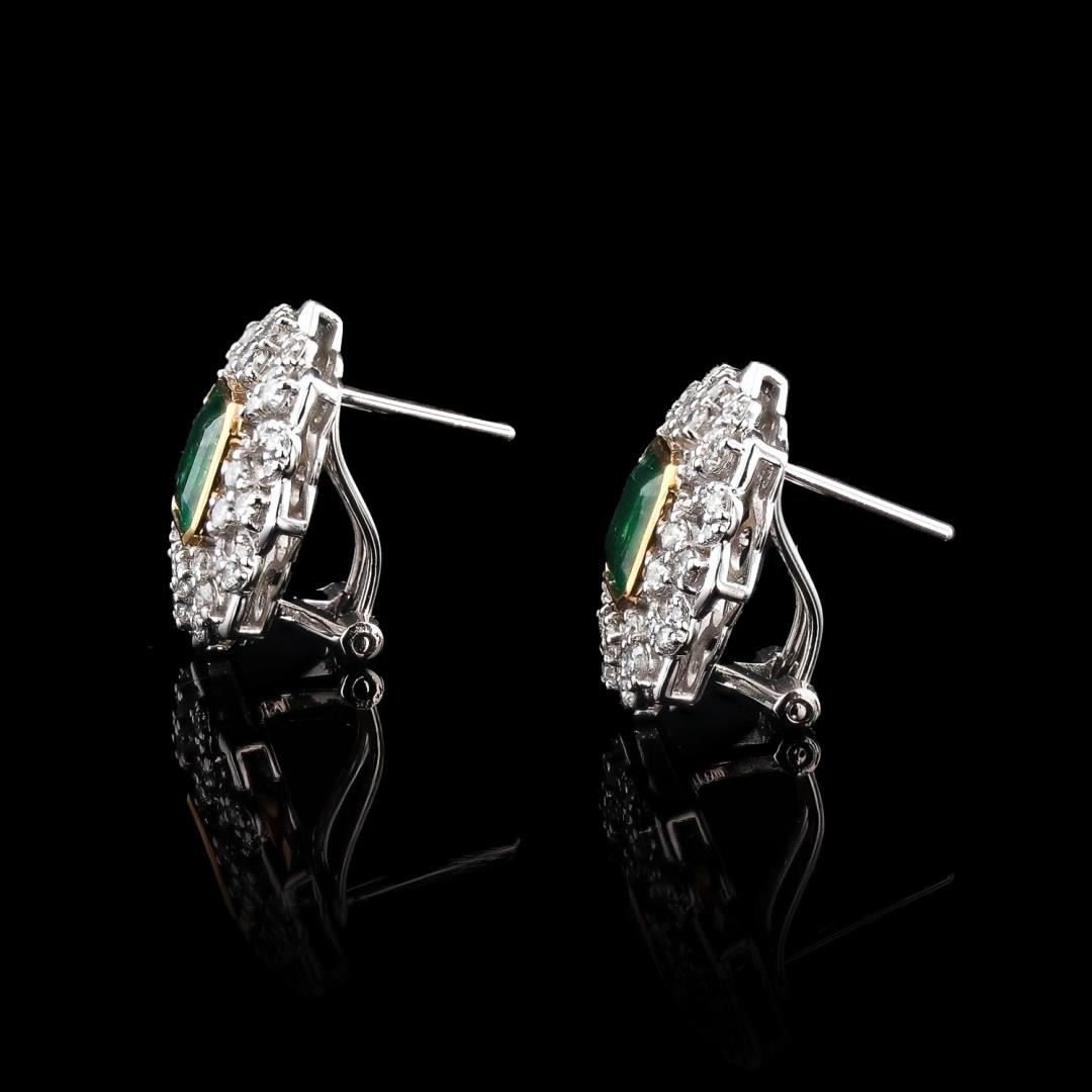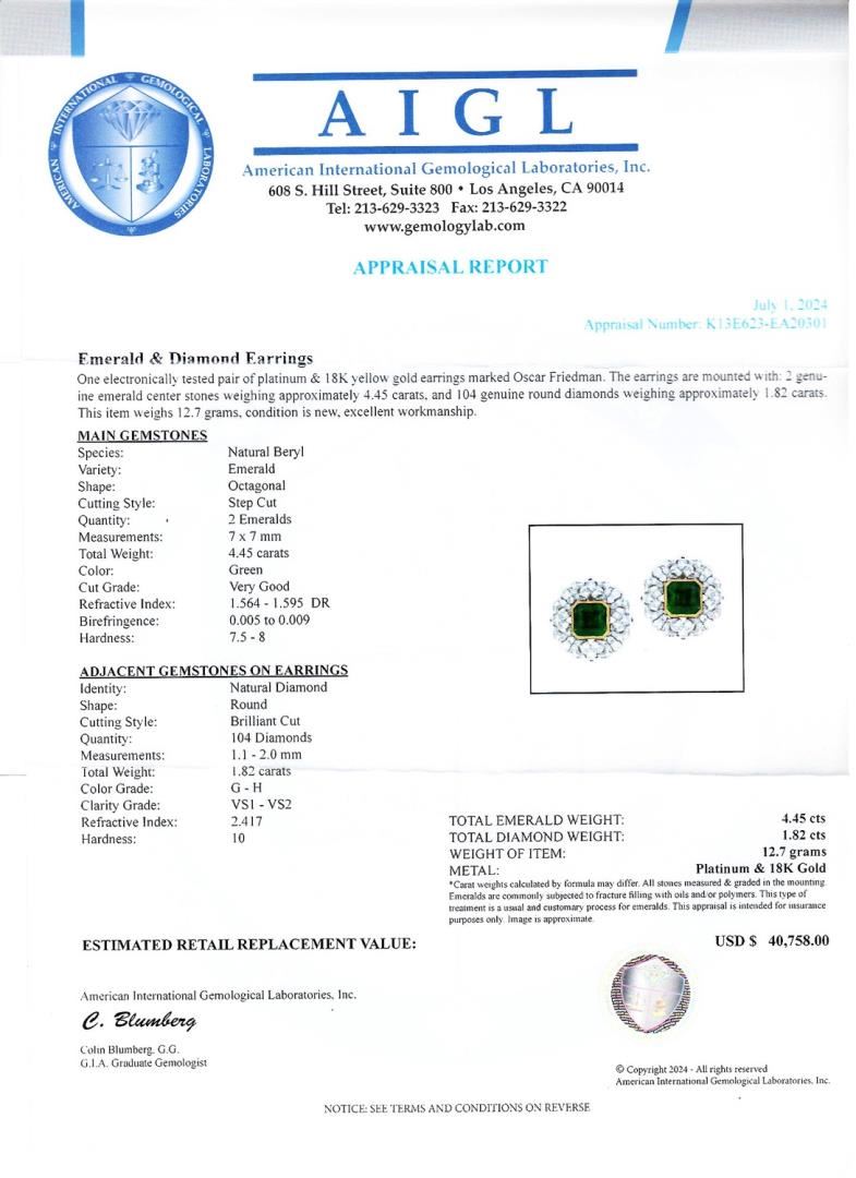 One electronically tested pair of platinum & 18K yellow gold earrings marked Oscar Friedman. The earrings are mounted with: 2 genuine emerald center stones weighing approximately 4.43 carats. and 104 genuine round diamonds weighing approximately 1.82 carats This item weighs 12.7 grams, condition is new, excellent workmanship. #MAIN GEMSTONES# Species: Natural Beryl; Variety: Emerald; Shape: Octagonal; Cutting Style: Step Cut; Quantity: 2 Emeralds; Measurements: 7 x 7mm; Total Weight: 4.45 carats; Color: Green; Cut Grade: Very Good; Refractive Index: 1.564 - 1.595 DR; Birefringence: 0.005 to 0.009; Hardness: 7.5 - 8 #ADJACENT GEMSTONES ON EARRINGS# Identity: Natural Diamond; Shape: Round; Cutting Style: Brilliant Cut; Quantity: 104 Diamonds; Measurements: 1.1 - 2.0mm; Total Weight: 1.82 carats; Color Grade: G-H; Clarity Grade: VS1-VS2; Refractive Index: 2.417; Hardness: 10; TOTAL EMERALD WEIGHT: 4.45 cts; TOTAL DIAMOND WEIGHT: 1.82 cts; WEIGHT OF ITEM: 12.7 grams; METAL: Platinum & 18K Gold