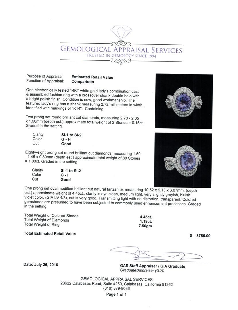 One electronically tested 14KT white gold lady's combination cast & assembled fashion ring with a crossover shank double halo with a bright polish finish. The featured lady's ring has a shank measuring 2.72 millimeters in width. Identified with markings of 'K14'. Condition is new, good workmanship. Containing: Two prong set round brilliant cut diamonds, measuring 2.70 - 2.65 x 1.66mm (depth est.) approximate total weight of 2 Stones = 0.15ct. Graded in the setting. Clarity SI-1 to SI-2. Color: G - H Cut Good Eighty-Eight prong set round brilliant cut diamonds, measuring 1.50 - 1.45 x 0.89mm (depth est.) approximate total weight of 88 Stones = 1.03ct. Graded in the setting. Clarity SI-1 to SI-2. Color: G - I Cut Good One prong set oval modified brilliant cut natural tanzanite, measuring 10.52 x 9.13 x 6.07mm, (depth est.) approximate weight of 4.45ct., clarity is eye clean, medium light, very slightly grayish, bluish violet color, (GIA bV 4/3), cut is very good. Transmitting light with no distortion, transparent. Colored gemstones are presumed to have been subjected to commonly used enhancement processes. Graded in the setting. Total Weight of Colored Stones 4.45ct.. Total Weight of Diamonds 1.18ct.. Total Weight of Ring 7.50gm. GAS Appraised at $8,755.00.