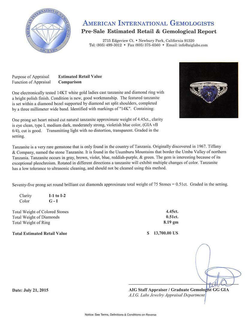 One electronically tested 14KT white gold ladies cast tanzanite and diamond ring with a bright polish finish. The featured tanzanite is set within a diamond bezel supported by diamond set split shoulders, completed by a three millimeter wide band. Identified with markings of "14K". Condition is new, good workmanship. Containing: One prong set heart mixed cut natural tanzanite approximate weight of 4.45ct., clarity is eye clean, type I, medium dark, moderately strong, violetish blue color, (GIA vB 6/4), cut is good. Transmitting light with no distortion, transparent. Graded in the setting. Tanzanite is a very rare gemstone that is only found in the country of Tanzania. Originally discovered in 1967. Tiffany & Company, named the stone Tanzanite. It is found in the Usumburu Mountains that border the Umba Valley of northern Tanzania. Tanzanite occurs in gray, brown, violet, blue, reddish-purple, & green. The gem is interesting because of its exceptional pleochroism. Rotated in different directions a tanzanite will exhibit multiple changes of color. Tanzanite has a low tolerance to ultrasonic cleaning, and should not be cleaned using this method. Seventy-Five prong set round brilliant cut diamonds approximate total weight of 75 Stones = 0.51ct. Graded in the setting. Clarity I-1 to I-2 Color G - I. Total Weight of Colored Stones 4.45ct. Total Weight of Diamonds 0.51ct. Total Weight of Ring 8.19 grams. AIG Appraised at $13,700.00.