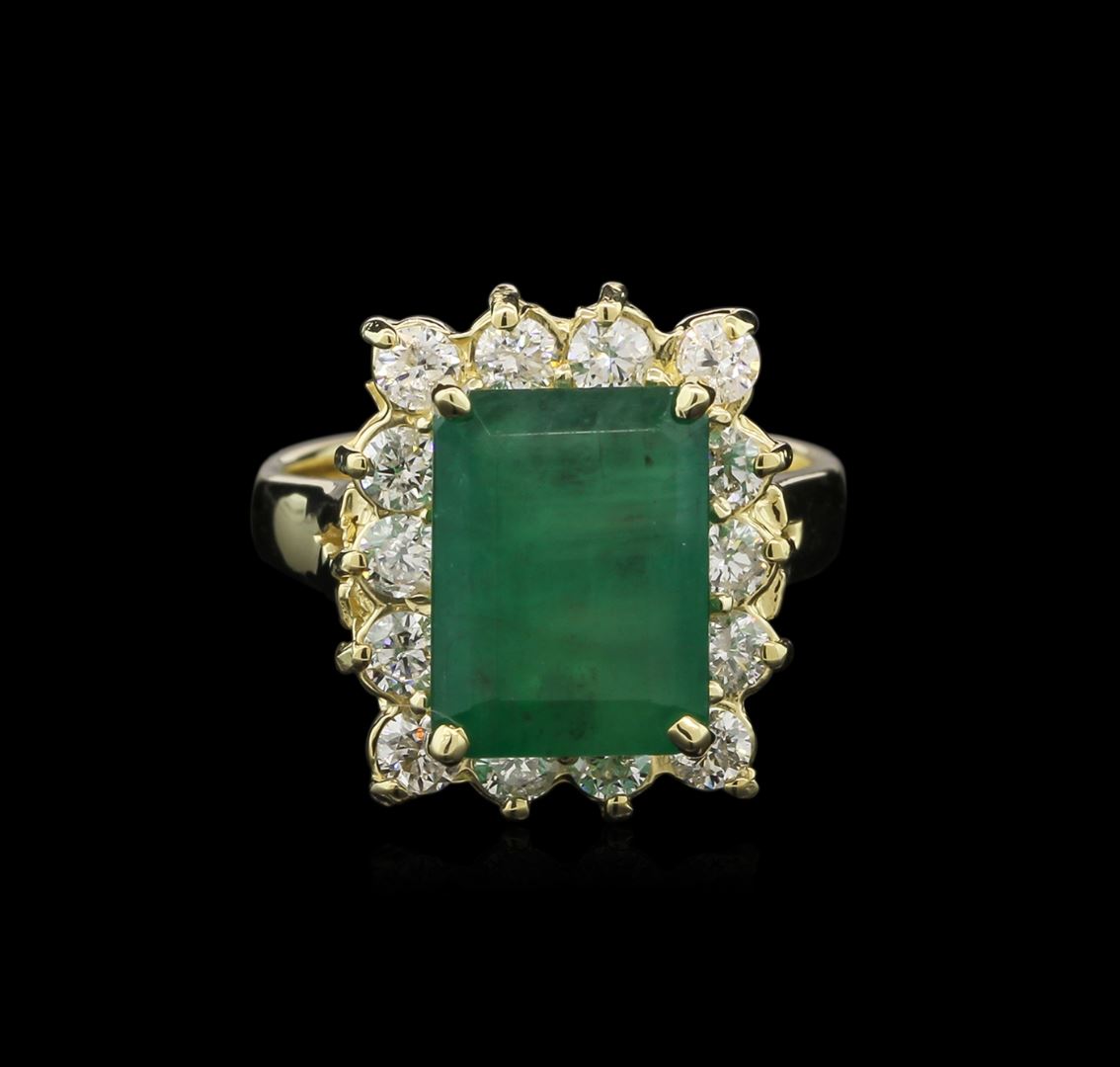 One electronically tested 14KT yellow gold ladies cast emerald and diamond ring with a bright polish finish. The featured emerald is set within a diamond bezel, completed by a two and one-half millimeter wide band. Identified with markings of "14K". Condition is new, good workmanship. Containing: One prong set rectangular step cut natural emerald exact weight 4.45ct., clarity is heavily included, type III, medium dark, very slightly grayish, very slightly bluish green color, (GIA vslbG 6/3), cut is good. Transmitting light somewhat diffusely, translucent. Naturally occurring internal & external characteristics are present. Indications of oil residue. Graded in the setting. Fourteen prong set round brilliant cut diamonds exact total weight 14 Stones = 1.01ct. Graded in the setting. Clarity: SI-2 to I-1. Color: G - I. Total Weight of Colored Stones 4.45ct. Total Weight of Diamonds 1.01ct. Total Weight of Ring 6.65gm. AIG Appraised at $7,810.00.