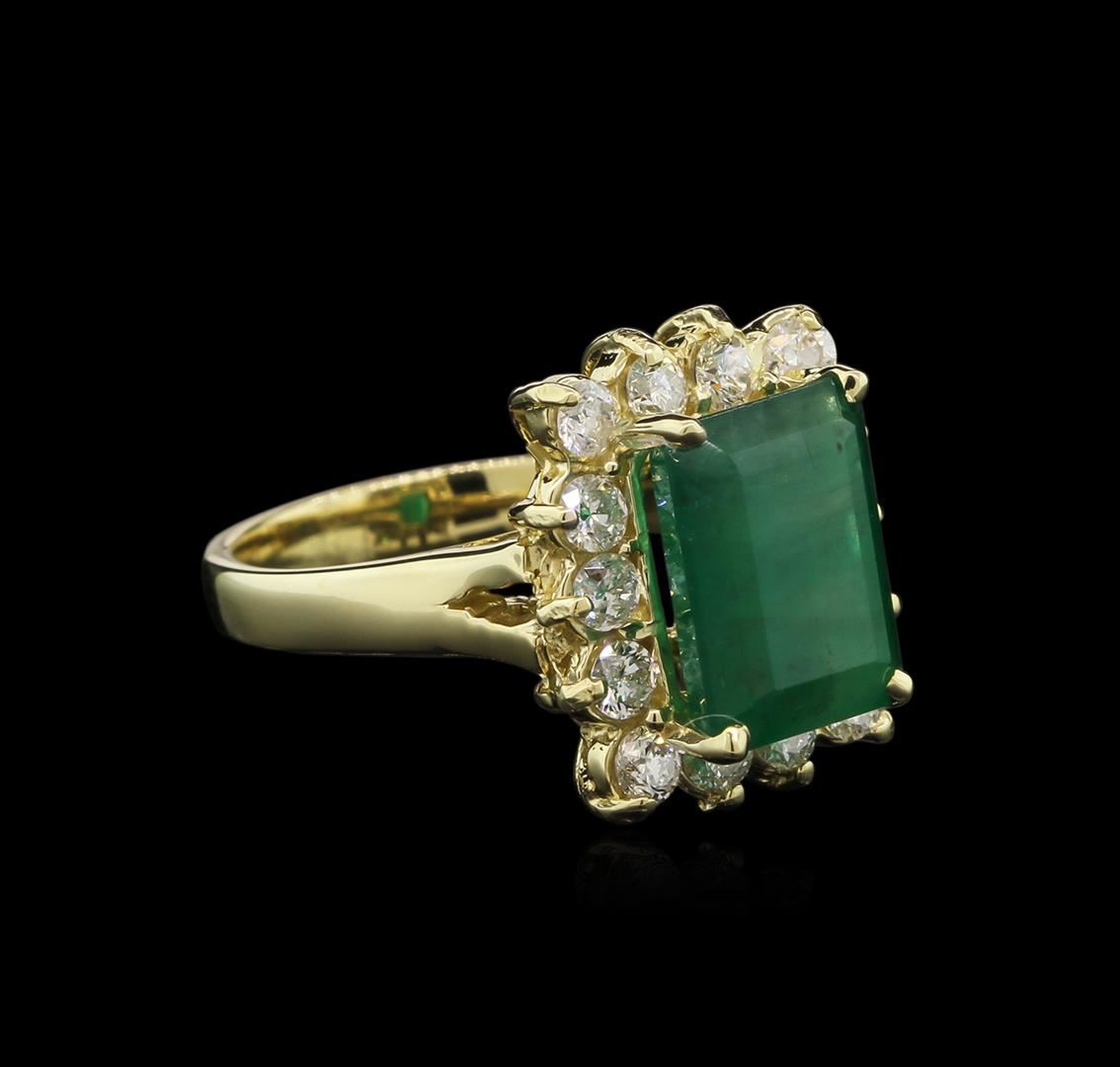 One electronically tested 14KT yellow gold ladies cast emerald and diamond ring with a bright polish finish. The featured emerald is set within a diamond bezel, completed by a two and one-half millimeter wide band. Identified with markings of "14K". Condition is new, good workmanship. Containing: One prong set rectangular step cut natural emerald exact weight 4.45ct., clarity is heavily included, type III, medium dark, very slightly grayish, very slightly bluish green color, (GIA vslbG 6/3), cut is good. Transmitting light somewhat diffusely, translucent. Naturally occurring internal & external characteristics are present. Indications of oil residue. Graded in the setting. Fourteen prong set round brilliant cut diamonds exact total weight 14 Stones = 1.01ct. Graded in the setting. Clarity: SI-2 to I-1. Color: G - I. Total Weight of Colored Stones 4.45ct. Total Weight of Diamonds 1.01ct. Total Weight of Ring 6.65gm. AIG Appraised at $7,810.00.