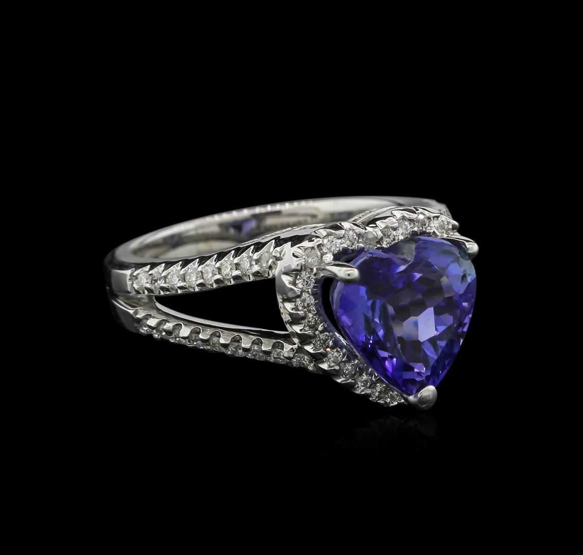One electronically tested 14KT white gold ladies cast tanzanite and diamond ring with a bright polish finish. The featured tanzanite is set within a diamond bezel supported by diamond set split shoulders, completed by a three millimeter wide band. Identified with markings of "14K". Condition is new, good workmanship. Containing: One prong set heart mixed cut natural tanzanite approximate weight of 4.45ct., clarity is eye clean, type I, medium dark, moderately strong, violetish blue color, (GIA vB 6/4), cut is good. Transmitting light with no distortion, transparent. Graded in the setting. Tanzanite is a very rare gemstone that is only found in the country of Tanzania. Originally discovered in 1967. Tiffany & Company, named the stone Tanzanite. It is found in the Usumburu Mountains that border the Umba Valley of northern Tanzania. Tanzanite occurs in gray, brown, violet, blue, reddish-purple, & green. The gem is interesting because of its exceptional pleochroism. Rotated in different directions a tanzanite will exhibit multiple changes of color. Tanzanite has a low tolerance to ultrasonic cleaning, and should not be cleaned using this method. Seventy-Five prong set round brilliant cut diamonds approximate total weight of 75 Stones = 0.51ct. Graded in the setting. Clarity I-1 to I-2 Color G - I. Total Weight of Colored Stones 4.45ct. Total Weight of Diamonds 0.51ct. Total Weight of Ring 8.19 grams. AIG Appraised at $13,700.00.