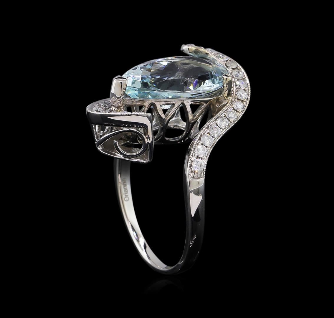 One electronically tested 14KT white gold lady's cast fashion ring with a bypass shank with a bright polish with milgrain detailing finish. The featured lady's ring has a shank measuring 1.81 millimeters wide. Trademark is Orianne. Identified with markings of "14K". Condition is new, good workmanship. Containing: One prong set pear modified brilliant cut natural aquamarine, measuring 15.75 x 9.35 x 5.92mm, approximate weight of 4.46ct., clarity is slightly included, type I, light, moderately strong, very slightly greenish blue color, (GIA vslgB 3/4), cut is good. Transmitting light with no distortion, transparent. Colored gemstones are presumed to have been subjected to commonly used enhancement processes. Graded in the setting. Twenty-Six prong set round brilliant cut diamonds, measuring 1.70 - 1.30 x 0.93mm (depth est.) approximate total weight of 26 Stones = 0.43ct. Graded in the setting. Clarity: SI-2 to I-2. Color: H - J. Cut Good. Total Weight of Colored Stones 4.46ct. Total Weight of Diamonds 0.43ct. Total Weight of Ring 6.80gm. GAS Appraised at $6,560.00.
