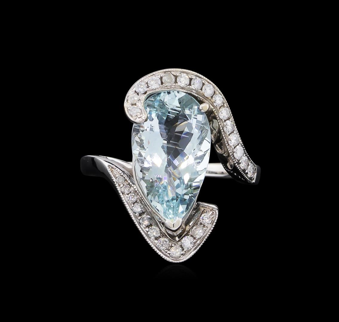 One electronically tested 14KT white gold lady's cast fashion ring with a bypass shank with a bright polish with milgrain detailing finish. The featured lady's ring has a shank measuring 1.81 millimeters wide. Trademark is Orianne. Identified with markings of "14K". Condition is new, good workmanship. Containing: One prong set pear modified brilliant cut natural aquamarine, measuring 15.75 x 9.35 x 5.92mm, approximate weight of 4.46ct., clarity is slightly included, type I, light, moderately strong, very slightly greenish blue color, (GIA vslgB 3/4), cut is good. Transmitting light with no distortion, transparent. Colored gemstones are presumed to have been subjected to commonly used enhancement processes. Graded in the setting. Twenty-Six prong set round brilliant cut diamonds, measuring 1.70 - 1.30 x 0.93mm (depth est.) approximate total weight of 26 Stones = 0.43ct. Graded in the setting. Clarity: SI-2 to I-2. Color: H - J. Cut Good. Total Weight of Colored Stones 4.46ct. Total Weight of Diamonds 0.43ct. Total Weight of Ring 6.80gm. GAS Appraised at $6,560.00.