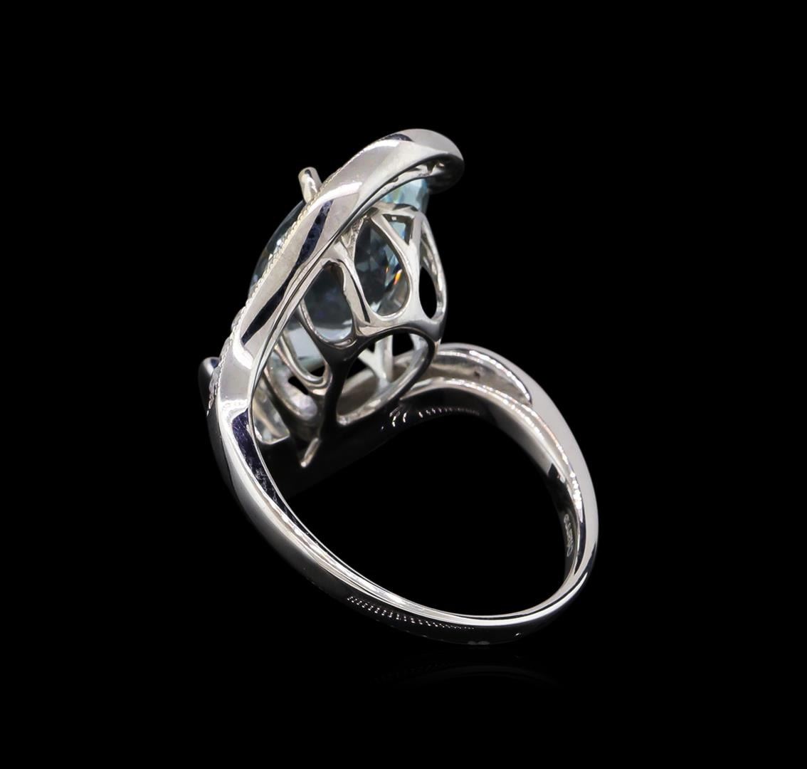 One electronically tested 14KT white gold lady's cast fashion ring with a bypass shank with a bright polish with milgrain detailing finish. The featured lady's ring has a shank measuring 1.81 millimeters wide. Trademark is Orianne. Identified with markings of "14K". Condition is new, good workmanship. Containing: One prong set pear modified brilliant cut natural aquamarine, measuring 15.75 x 9.35 x 5.92mm, approximate weight of 4.46ct., clarity is slightly included, type I, light, moderately strong, very slightly greenish blue color, (GIA vslgB 3/4), cut is good. Transmitting light with no distortion, transparent. Colored gemstones are presumed to have been subjected to commonly used enhancement processes. Graded in the setting. Twenty-Six prong set round brilliant cut diamonds, measuring 1.70 - 1.30 x 0.93mm (depth est.) approximate total weight of 26 Stones = 0.43ct. Graded in the setting. Clarity: SI-2 to I-2. Color: H - J. Cut Good. Total Weight of Colored Stones 4.46ct. Total Weight of Diamonds 0.43ct. Total Weight of Ring 6.80gm. GAS Appraised.