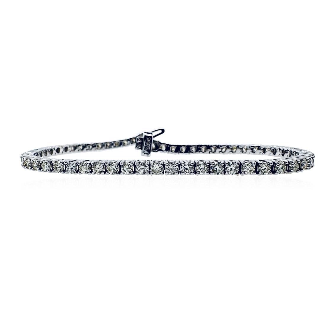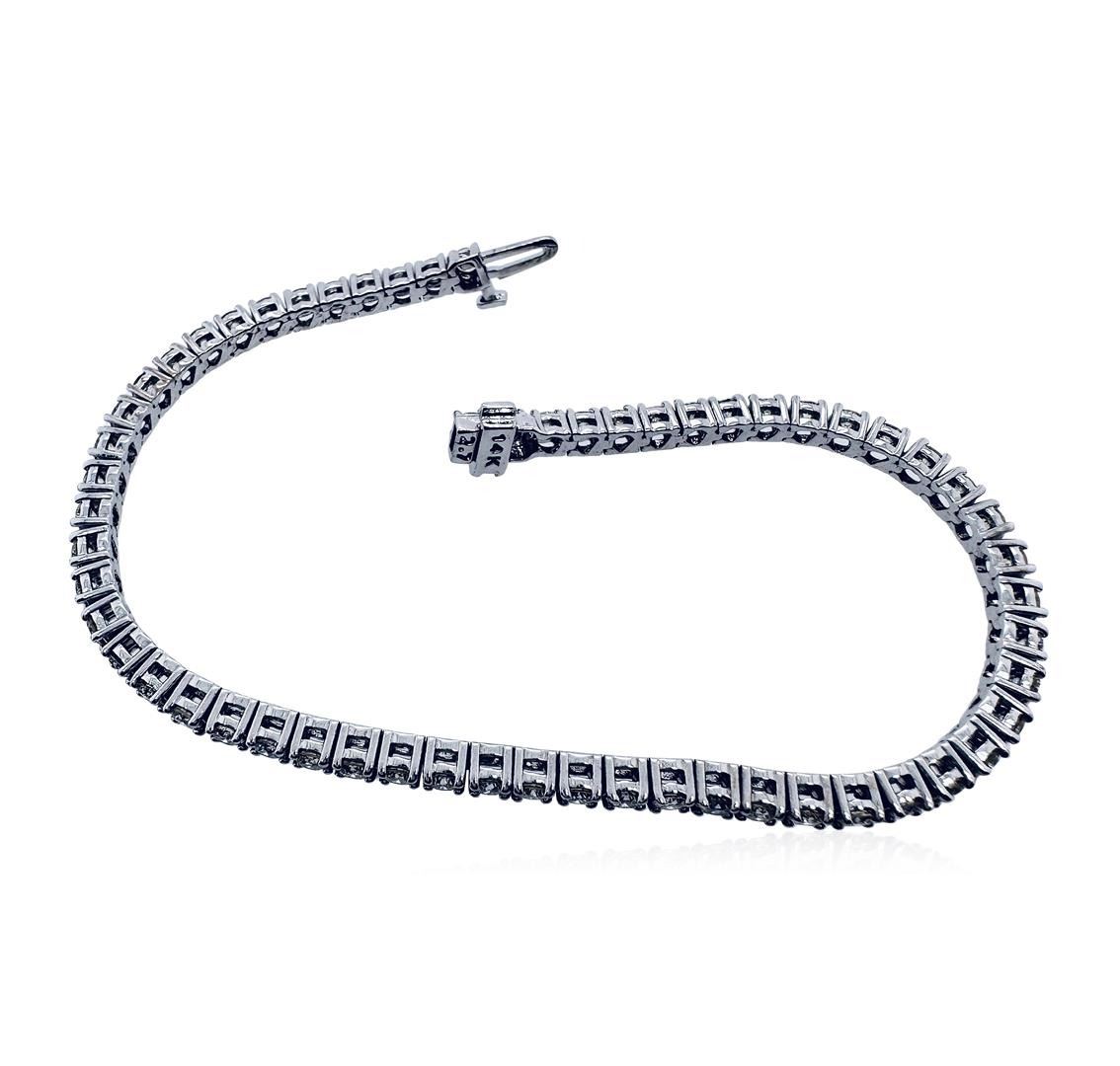 One electronically tested 14KT white gold lady's combination cast & assembled fashion straight line tennis bracelet with a tongue clasp with fold-under safety with a basket motif with a bright polish finish. Condition is new, good workmanship. The featured lady's bracelet measures approximately 7.00 inches in length. ldentified with markings of "14K". Containing: Fifty-nine prong set round brilliant cut diamonds, measuring 2.65 - 2.60 X 1.64mm (depth est.) , 5.00% GTCF approximate total weight of 59 Stones = 4.46ct. Graded in the setting. VS-2 to SI-2. Very Good. Total weight of Diamonds 4.46ct. Estimated Retail Value $11350.00