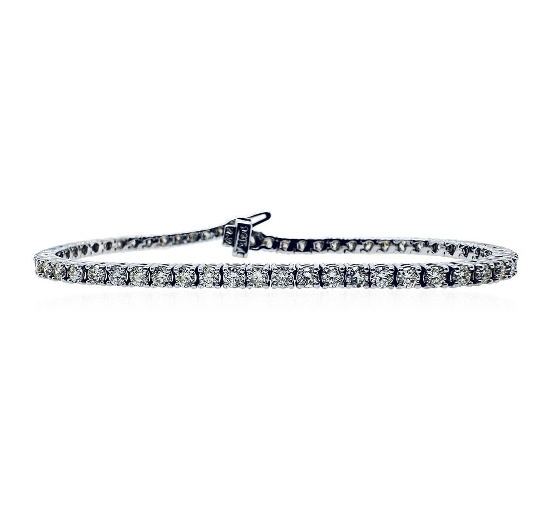 One electronically tested 14KT white gold lady's combination cast & assembled fashion straight line tennis bracelet with a tongue clasp with fold-under safety with a basket motif with a bright polish finish. Condition is new, good workmanship. The featured lady's bracelet measures approximately 7.00 inches in length. ldentified with markings of "14K". Containing: Fifty-nine prong set round brilliant cut diamonds, measuring 2.65 - 2.60 X 1.64mm (depth est.), 5.00% GTCF approximate total weight of 59 Stones = 4.46ct. Graded in the setting. VS-2 to SI-2. Very Good. Total weight of Diamonds 4.46ct. Estimated Retail Value $11350.00