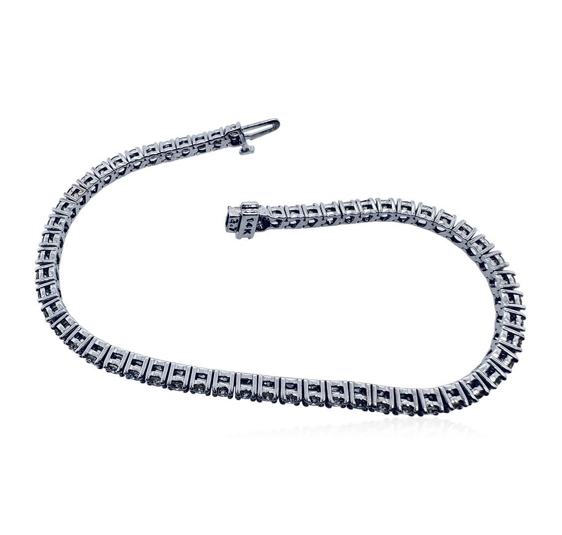 One electronically tested 14KT white gold lady's combination cast & assembled fashion straight line tennis bracelet with a tongue clasp with fold-under safety with a basket motif with a bright polish finish. Condition is new, good workmanship. The featured lady's bracelet measures approximately 7.00 inches in length. ldentified with markings of "14K". Containing: Fifty-nine prong set round brilliant cut diamonds, measuring 2.65 - 2.60 X 1.64mm (depth est.), 5.00% GTCF approximate total weight of 59 Stones = 4.46ct. Graded in the setting. VS-2 to SI-2. Very Good. Total weight of Diamonds 4.46ct. Estimated Retail Value $11350.00