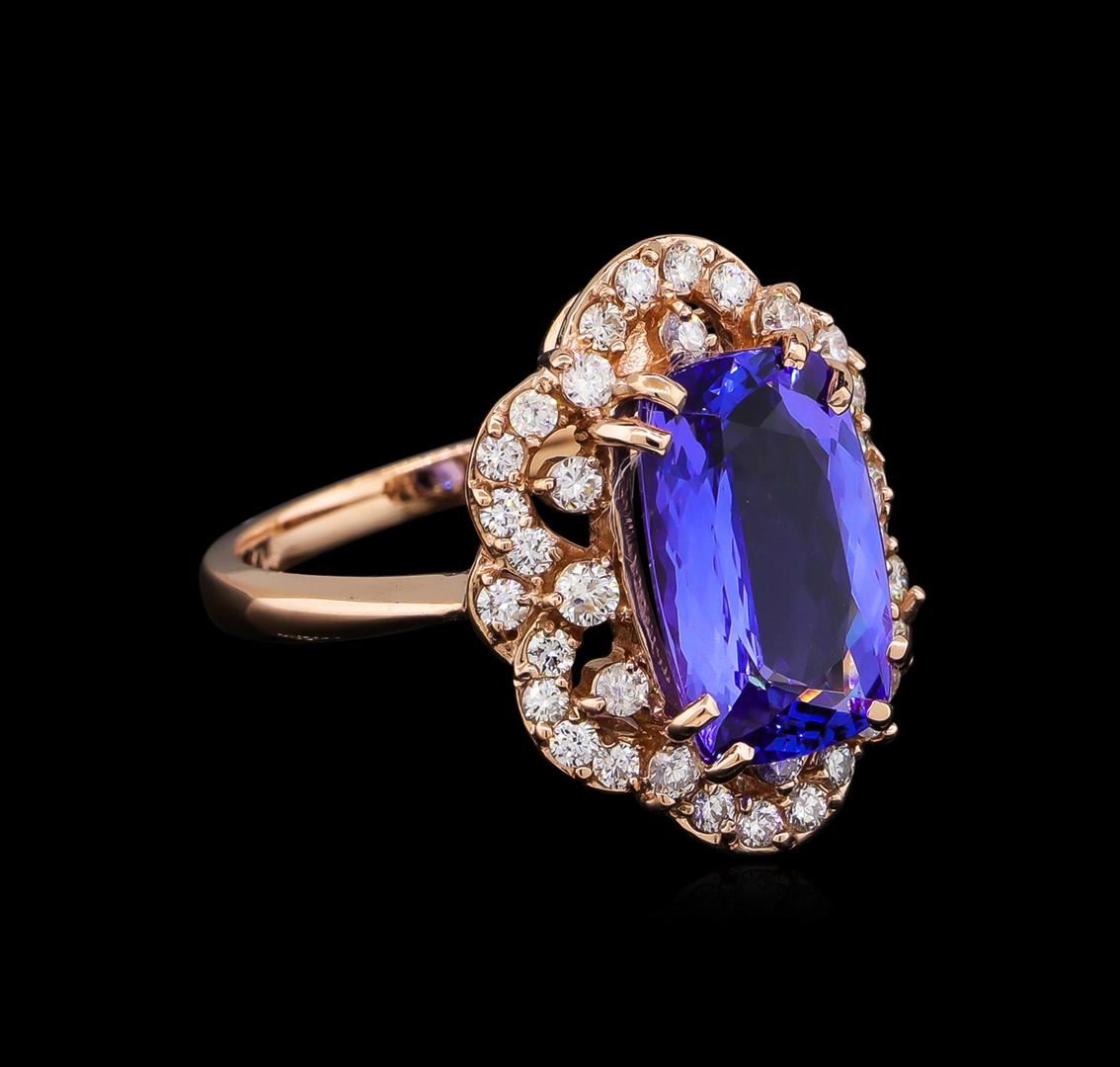 One electronically tested 14KT rose gold lady's cast fashion ring with a scalloped basket halo with a bright polish finish. The featured lady's ring has a shank measuring 2.06 millimeters wide. Identified with markings of "K14". Condition is new, good workmanship. Containing: One prong set rectangular cushion modified brilliant cut natural tanzanite, measuring 12.88 x 8.31 x 4.76mm, 10%. bulge factor, approximate weight of 4.46ct., clarity is eye clean, type I, medium dark, moderately strong, violetish blue color, (GIA vB 6/4), cut is excellent. Transmitting light with no distortion, transparent. Colored gemstones are presumed to have been subjected to commonly used enhancement processes. Graded in the setting. Four prong set round brilliant cut diamonds, measuring 2.10 - 2.00 x 1.27mm (depth est.) approximate total weight of 4 Stones = 0.13ct. Graded in the setting. Clarity: SI-1 to SI-2. Color: H - I. Cut Good Thirty-Four prong set round brilliant cut diamonds, measuring 1.80 - 1.50 x 1.03mm (depth est.) approximate total weight of 34 Stones = 0.55ct. Graded in the setting. Clarity: VS-2 to SI-2. Color: H - I. Cut Good. Total Weight of Colored Stones 4.46ct. Total Weight of Diamonds 0.68ct. Total Weight of Ring 6.10gm. GAS Appraised at $10,525.00.