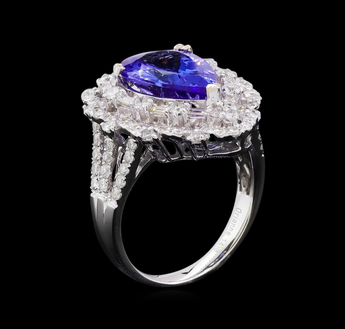 One electronically tested 14KT white gold ladies cast tanzanite and diamond ring with a bright polish finish. The featured tanzanite is set within tiered stylized diamond bezel supported by diamond set three-way split shoulders, completed by a two and one-half millimeter wide band. Trademark is Orianne. Identified with markings of "14K". Condition is new, good workmanship. Containing: One prong set pear mixed cut natural tanzanite, measuring 13.80 x 8.80 x 5.18mm, 6%. bulge factor, approximate weight of 4.47ct., clarity is eye clean, type I, medium dark, very slightly grayish, bluish violet color, (GIA bV 6/3), cut is good. Transmitting light with no distortion, transparent. Graded in the setting. Tanzanite is a very rare gemstone that is only found in the country of Tanzania. Originally discovered in 1967. Tiffany & Company, named the stone Tanzanite. It is found in the Usumburu Mountains that border the Umba Valley of northern Tanzania. Tanzanite occurs in gray, brown, violet, blue, reddish-purple, & green. The gem is interesting because of its exceptional pleochroism. Rotated in different directions a tanzanite will exhibit multiple changes of color. Tanzanite has a low tolerance to ultrasonic cleaning, and should not be cleaned using this method. One Hundred One prong set round brilliant & baguette cut diamonds approximate total weight of 101 Stones = 1.50ct. Graded in the setting. Clarity: VS-2 to I-1. Color: G - I. Total Weight of Colored Stones 4.47ct. Total Weight of Diamonds 1.50ct. Total Weight of Ring 7.83gm. AIG Appraised at $15,820.00.