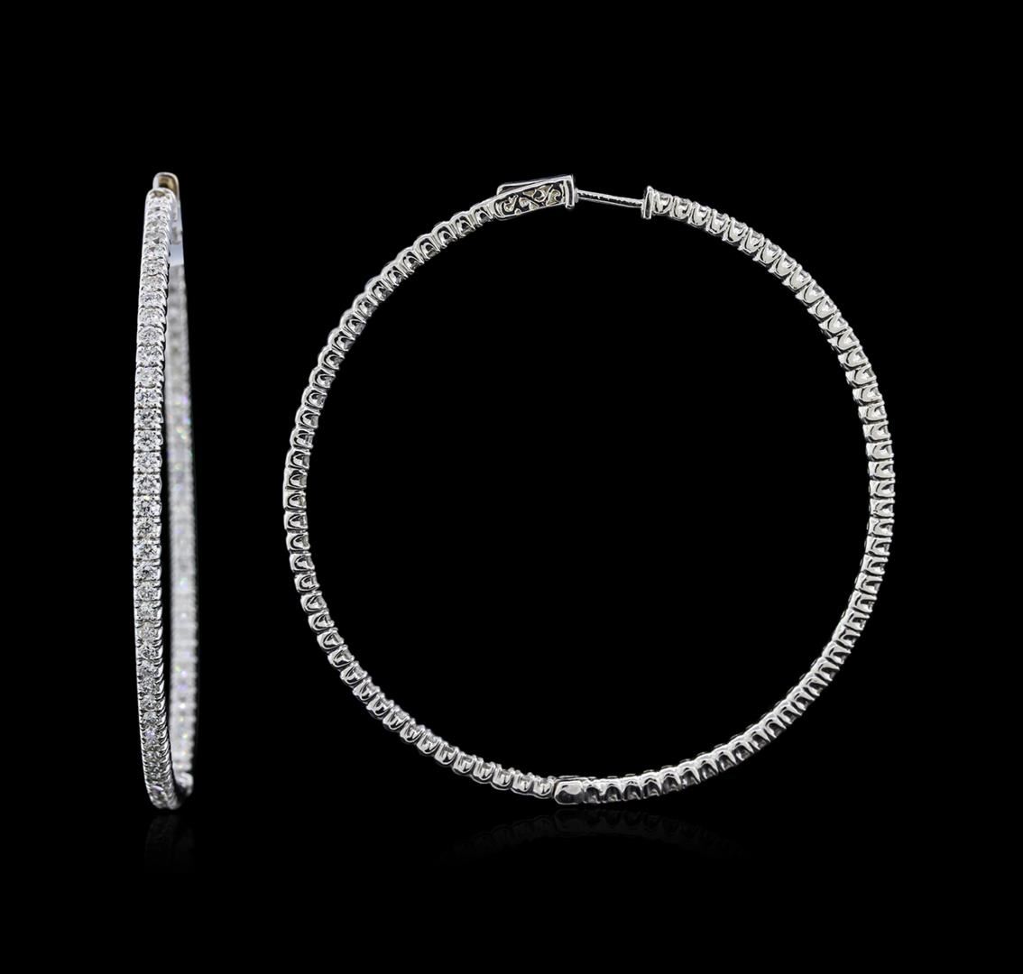 One pair electronically tested 14KT white gold ladies cast diamond hoop earrings with hinged clip backs with a bright polish finish. Measurements: 2.50" in diameter. Condition is very good. Containing: One Hundred Seventy-Eight prong set round brilliant cut diamonds, measuring 1.90 - 1.90 x 1.14mm (depth est.) approximate total weight of 178 Stones = 4.47ct. Clarity: SI-1 to SI-2. Color: H - I, Cut is Good. Diamonds are graded in the mounting, unless otherwise stated. Total Weight of Diamonds 4.47ct. Total Weight of Hoop Earrings 19.20 grams. GGL Appraised at $8,925.00.