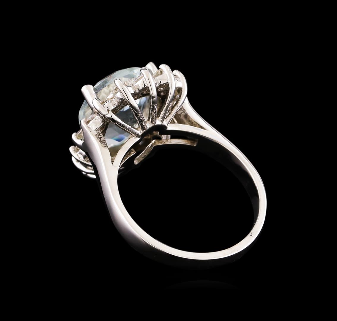 One electronically tested 14KT white gold lady's cast fashion ring with a basket halo with a bright polish finish. The featured lady's ring has a shank measuring 2.32 millimeters wide. Identified with markings of "14K". Condition is new, good workmanship. Containing: One prong set pear modified brilliant cut natural aquamarine, measuring 14.05 x 9.95 x 6.14mm, approximate weight of 4.48ct., clarity is slightly included, light, moderately strong, very slightly greenish blue color, (GIA vslgB 3/4), cut is very good. Transmitting light with a minimum of distortion, transparent. Colored gemstones are presumed to have been subjected to commonly used enhancement processes. Graded in the setting. Sixteen prong set round brilliant cut diamonds, measuring 2.40 - 2.30 x 1.46mm (depth est.) approximate total weight of 16 Stones = 0.80ct. Graded in the setting. Clarity: SI-1 to SI-2. Color: H - I. Cut Good. Total Weight of Colored Stones 4.48ct. Total Weight of Diamonds 0.80ct. Total Weight of Ring 6.80gm. GAS Appraised at $8,395.00.