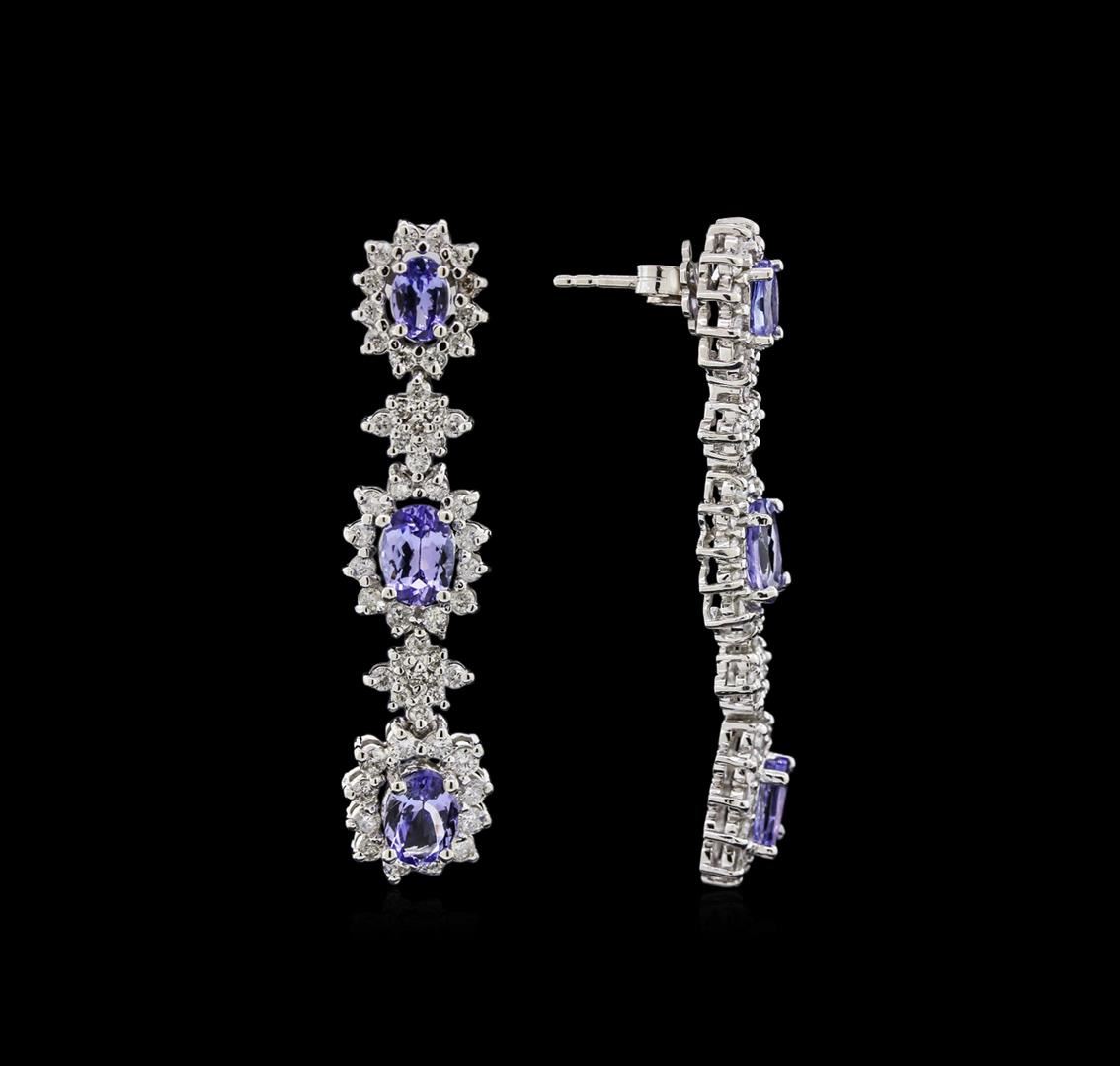 One pair electronically tested 14KT white gold lady's combination cast & assembled fashion earrings with friction posts with a bright polish finish. Identified with markings of "585". Condition is new, good workmanship. Containing: Four prong set oval modified brilliant cut natural tanzanites, measuring 7.15 x 5.15 x 3.07mm, 8% bulge factor, approximate total weight of 3.48ct., clarity is eye clean, type I, medium light, very slightly grayish, bluish violet color, (GIA bV 4/3), cut is good. Transmitting light with no distortion, transparent. Colored gemstones are presumed to have been subjected to commonly used enhancement processes. Graded in the setting. Two prong set oval modified brilliant cut natural tanzanites, measuring 5.60 x 4.07 x 2.69mm, 8% bulge factor, approximate total weight of 1.00ct., clarity is eye clean, type I, medium light, very slightly grayish, bluish violet color, (GIA bV 4/3), cut is good. Transmitting light with no distortion, transparent. Colored gemstones are presumed to have been subjected to commonly used enhancement processes. Graded in the setting. One Hundred Eight prong set round brilliant cut diamonds, measuring 1.80 - 1.70 x 1.12mm (depth est.) approximate total weight of 108 Stones = 2.28ct. Graded in the setting. Clarity: SI-2 to I-1. Color: H - I. Cut Good. Total Weight of Colored Stones 4.48ct. Total Weight of Diamonds 2.28ct. Total Weight of Earrings 11.40gm. GAS Appraised at $8,760.00.