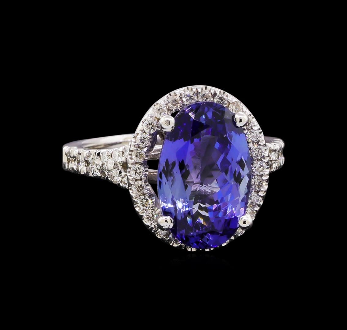One electronically tested 14KT white gold lady's cast fashion ring with a split shank halo with a bright polish finish. Featured lady's ring has a shank measuring 2.10 millimeters in width. Identified with markings of "14K". Condition is new, good workmanship. Containing: One prong set oval modified brilliant cut natural tanzanite, measuring 12.81 x 8.27 x 5.44mm, (depth est.) approximate weight of 4.48ct., clarity is eye clean, medium, very slightly grayish, violetish blue color, (GIA vB 5/3), cut is very good. Transmitting light with no distortion, transparent. Colored gemstones are presumed to have been subjected to commonly used enhancement processes. Graded in the setting. Six prong set round brilliant cut diamonds, measuring 1.50 - 1.40 x 0.91mm (depth est.) approximate total weight of 6 Stones = 0.08ct. Graded in the setting. Clarity: SI-1 to SI-2. Color: G - Good Thirty-Eight prong set round brilliant cut diamonds, measuring 1.40 - 1.30 x 0.81mm (depth est.) approximate total weight of 38 Stones = 0.33ct. Graded in the setting. Clarity: SI-1 to I-1. Color: G - Good. Total Weight of Colored Stones 4.48ct. Total Weight of Diamonds 0.41ct. Total Weight of Ring 5.30gm. GAS Appraised at $8,900.00.
