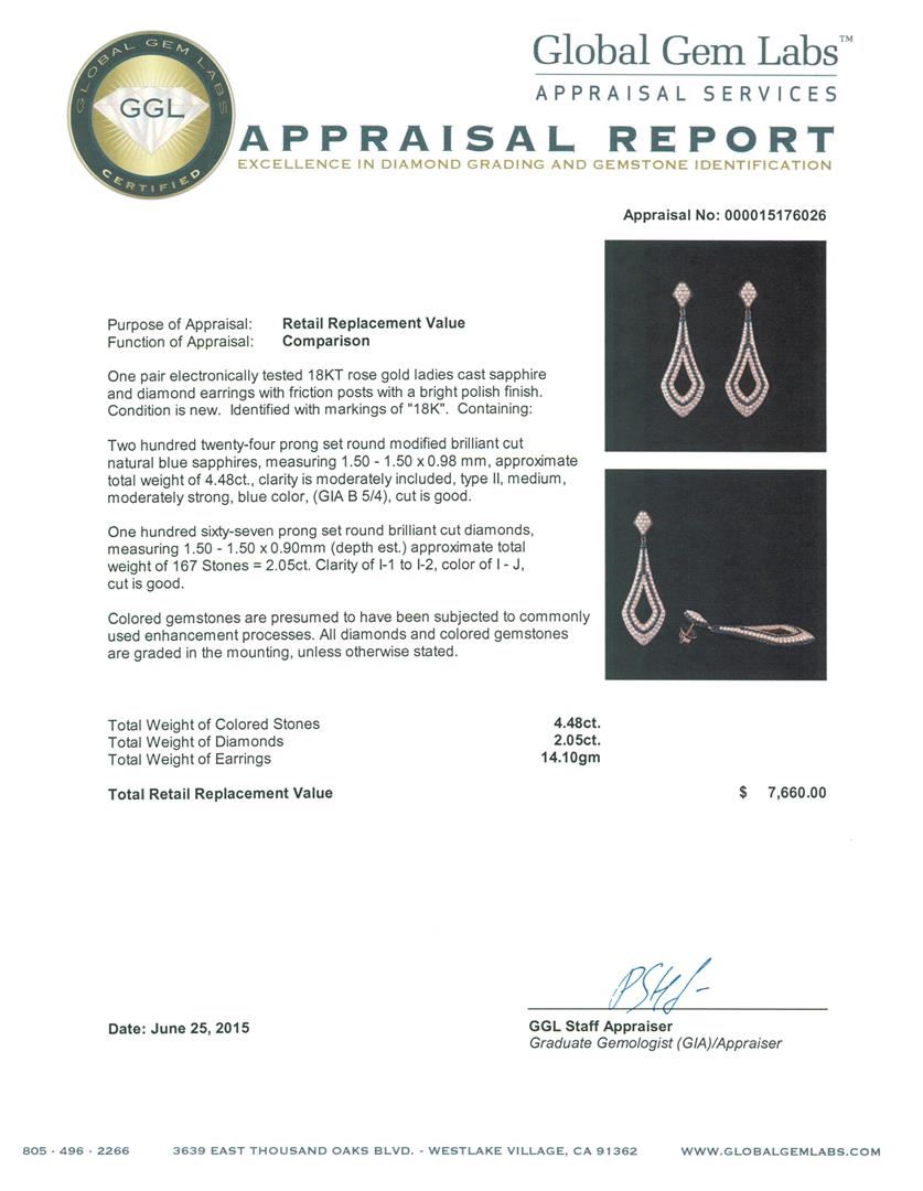 One pair electronically tested 18KT rose gold ladies cast sapphire and diamond earrings with friction posts with a bright polish finish. Identified with markings of "18K". Condition is new. Containing: Two hundred twenty-four prong set round modified brilliant cut natural blue sapphires, measuring 1.50 - 1.50 x 0.98 mm, approximate. Total Weight of 4.48ct., clarity is moderately included, type II, medium, moderately strong, blue color, (GIA B 5/4), cut is good. One Hundred Sixty-Seven prong set round brilliant cut diamonds, measuring 1.50 - 1.50 x 0.90mm (depth est.) approximate. Total Weight of 167 Stones = 2.05ct. Clarity: I-1 to I-2. Color: I - J, Cut is Good. Colored gemstones are presumed to have been subjected to commonly used enhancement processes. All diamonds and colored gemstones are graded in the mounting, unless otherwise stated. Total Weight of Colored Stones 4.48ct. Total Weight of Diamonds 2.05ct. Total Weight of Earrings 14.10 grams. GGL Appraised at $7,660.00.