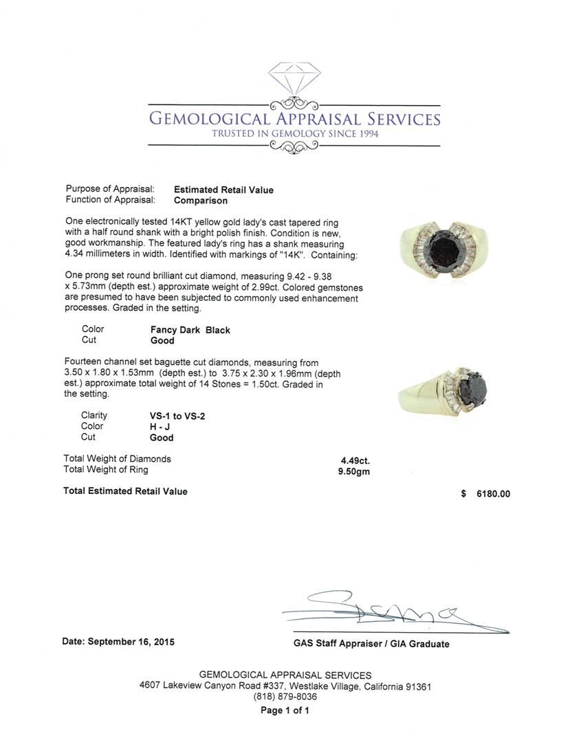 One electronically tested 14KT yellow gold lady's cast tapered ring with a half round shank with a bright polish finish. The featured lady's ring has a shank measuring 4.34 millimeters in width. Identified with markings of "14K". Condition is new, good workmanship. Containing: One prong set round brilliant cut diamond, measuring 9.42 - 9.38 x 5.73mm (depth est.) approximate weight of 2.99ct. Colored gemstones are presumed to have been subjected to commonly used enhancement processes. Graded in the setting. Cut Good Fourteen channel set baguette cut diamonds, measuring from 3.50 x 1.80 x 1.53mm (depth est.) to 3.75 x 2.30 x 1.96mm (depth est.) approximate total weight of 14 Stones = 1.50ct. Graded in the setting. Clarity: VS-1 to VS-2. Color: H - J. Cut Good. Total Weight of Diamonds 4.49ct. Total Weight of Ring 9.50gm. GAS Appraised at $6,180.00.