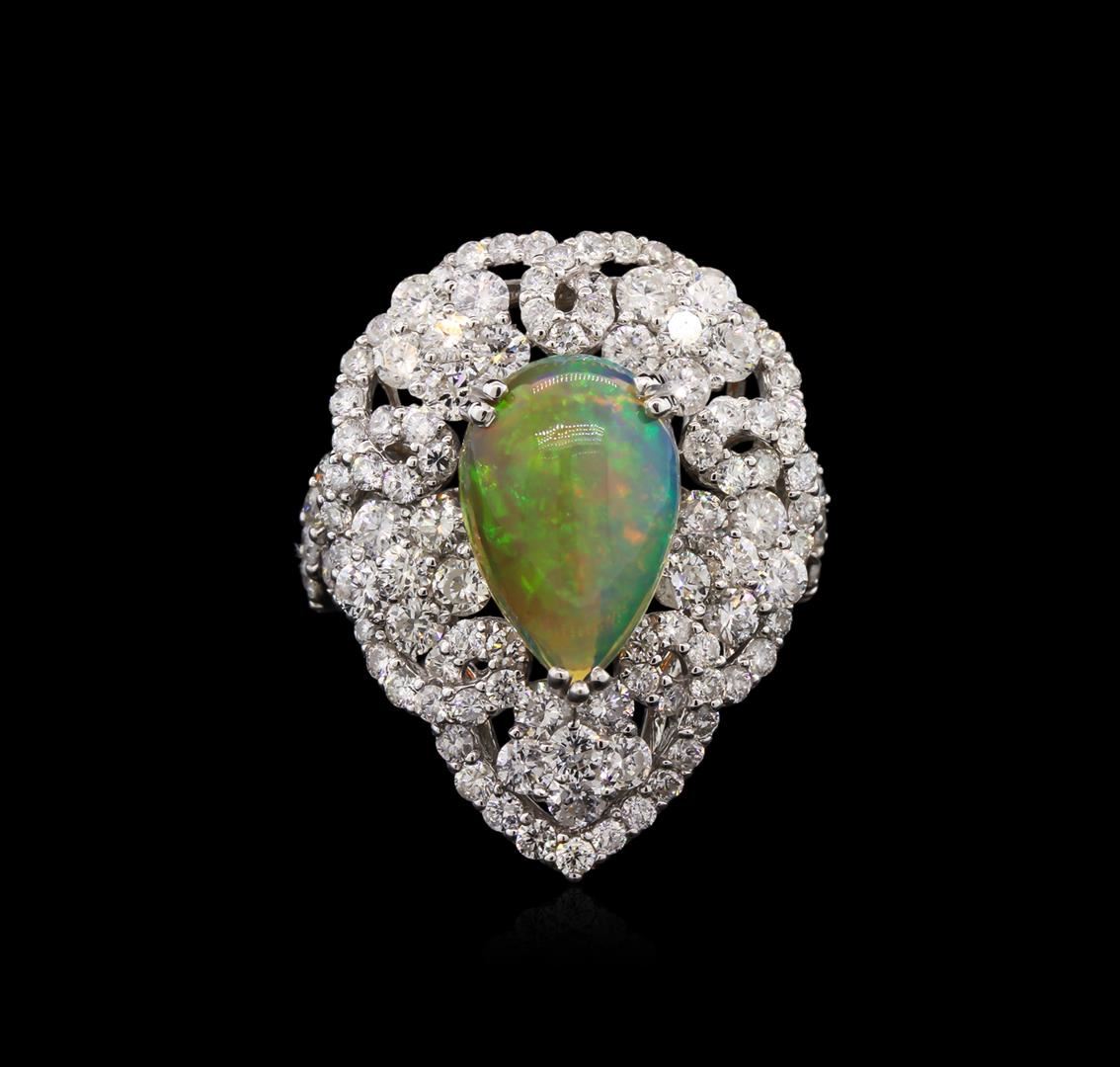 One electronically tested 18KT white gold lady's cast fashion ring with a split shank with a bright polish finish. The featured lady's ring has scalloped halo motif and a shank measuring 3.81 millimeters wide. Identified with markings of "18K 750". Condition is new, good workmanship. Containing: One jelly opal that is cut in a pear shaped cabochon and is prong set, measuring 14.30 mm long x 9.55 mm wide, and 4.80 mm thick and the approximate weight is 4.50 carats. The opal has a bright, blue-green play of color (fire) in a rolling flashfire pattern; a medium dome; a good cut; ; slight variation in base in its brightness and pattern; and is very directional. Graded in the setting. Thirty prong set round brilliant cut diamonds, measuring 2.80 - 2.50 x 1.59mm (depth est.) approximate total weight of 30 Stones = 2.05ct. Graded in the setting. Clarity: SI-2 to I-1. Color: G - I. Cut Good Ninety prong set round brilliant cut diamonds, measuring 1.90 - 1.65 x 1.10mm (depth est.) approximate total weight of 90 Stones = 1.90ct. Graded in the setting. Clarity: SI-2 to I-1. Color: G - I. Cut Good. Total Weight of Diamonds 3.95ct. Total Weight of Opals 4.50ct. Total Weight of Ring 10.20gm. GAS Appraised at $11,050.00.