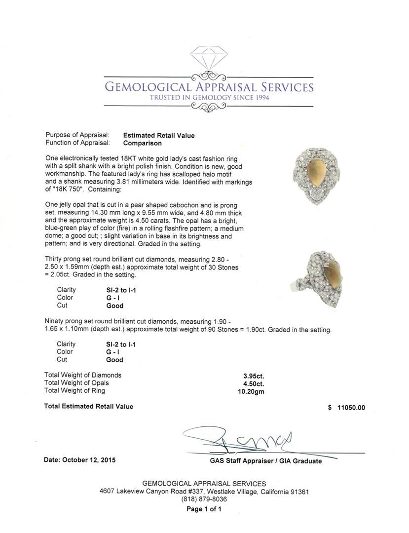 One electronically tested 18KT white gold lady's cast fashion ring with a split shank with a bright polish finish. The featured lady's ring has scalloped halo motif and a shank measuring 3.81 millimeters wide. Identified with markings of "18K 750". Condition is new, good workmanship. Containing: One jelly opal that is cut in a pear shaped cabochon and is prong set, measuring 14.30 mm long x 9.55 mm wide, and 4.80 mm thick and the approximate weight is 4.50 carats. The opal has a bright, blue-green play of color (fire) in a rolling flashfire pattern; a medium dome; a good cut; ; slight variation in base in its brightness and pattern; and is very directional. Graded in the setting. Thirty prong set round brilliant cut diamonds, measuring 2.80 - 2.50 x 1.59mm (depth est.) approximate total weight of 30 Stones = 2.05ct. Graded in the setting. Clarity: SI-2 to I-1. Color: G - I. Cut Good Ninety prong set round brilliant cut diamonds, measuring 1.90 - 1.65 x 1.10mm (depth est.) approximate total weight of 90 Stones = 1.90ct. Graded in the setting. Clarity: SI-2 to I-1. Color: G - I. Cut Good. Total Weight of Diamonds 3.95ct. Total Weight of Opals 4.50ct. Total Weight of Ring 10.20gm. GAS Appraised at $11,050.00.