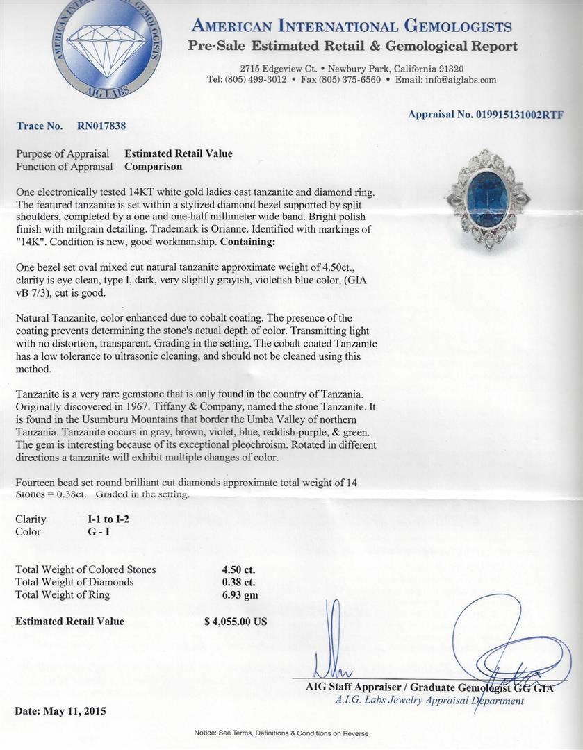 One electronically tested white gold ladies cast tanzanite and diamond ring. Condition is new, good workmanship. The featured tanzanite is set within a stylized diamond bezel supported by split shoulders, completed by a one and one-half millimeter wide band. Bright polish finish with milgrain detailing. Trademark is Orianne. Identified with markings of" 14K". Containing: One bezel set oval mixed cut natural tanzanite approximate weight of 4.50ct., clarity is eye clean, type I, dark, very slightly grayish, violetish blue color, (GIA vB 7/3), cut is good. Natural Tanzanite, color enhanced due to cobalt coating. The presence of the coating prevents determining the stone's actual depth of color. Transmitting light with no distortion, transparent. Grading in the setting. The cobalt coated Tanzanite has a low tolerance to ultrasonic cleaning, and should not be cleaned using this method. Tanzanite is a very rare gemstone that is only found in the country of Tanzania. Originally discovered in 1967.Tiffany & Company, named the stone Tanzanite. It is found in the Usumburu Mountains that border the Umba Valley of northern Tanzania. Tanzanite occurs in gray, brown, violet, blue, reddish-purple, & green. The gem is interesting because of its exceptional pleochroism. Rotated in different directions a tanzanite will exhibit multiple changes of color. Fourteen bead set round brilliant cut diamonds approximate total weight of 14 Stones = 0.38ct. Graded in the setting. Clarity: I-1 to I-2.Color: G - I. AIG Appraised at $4,055.00.