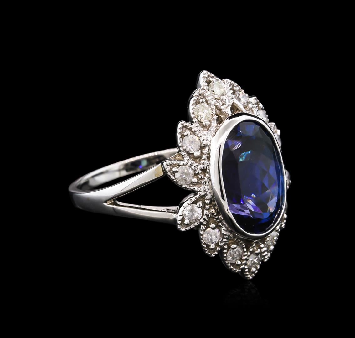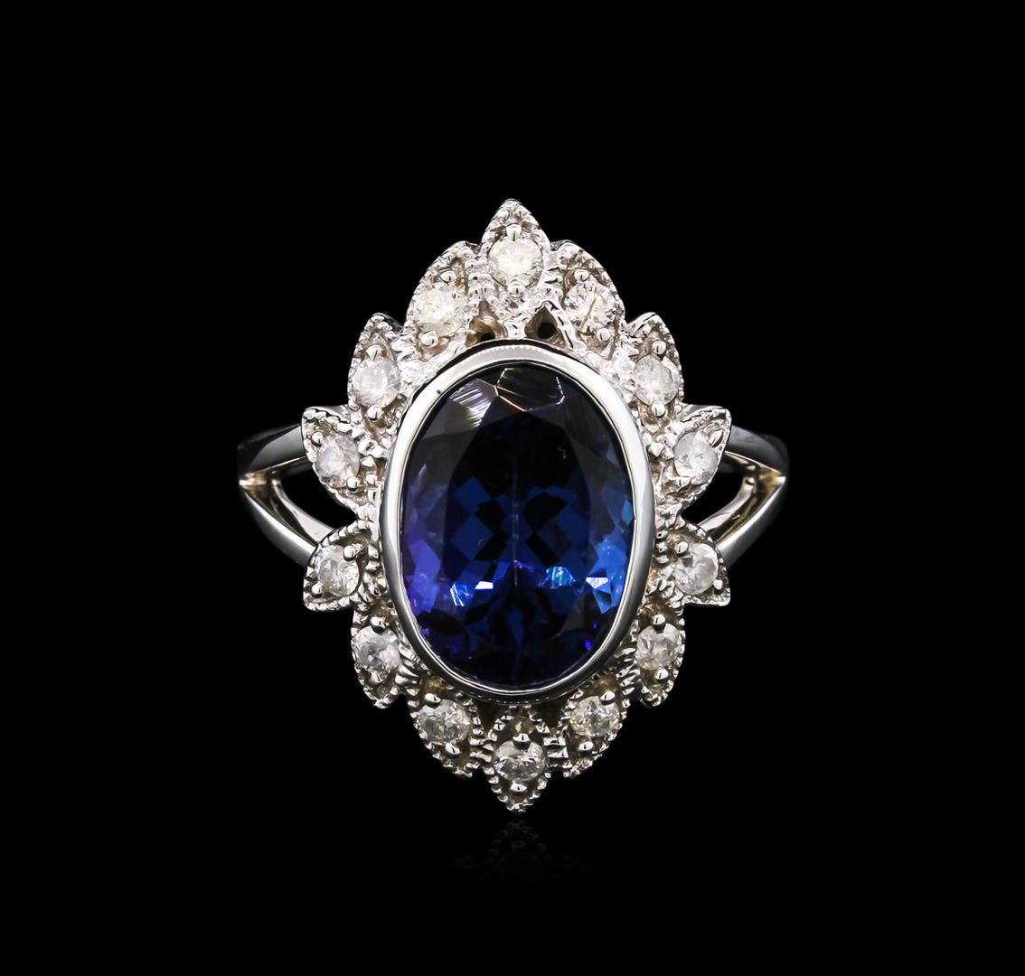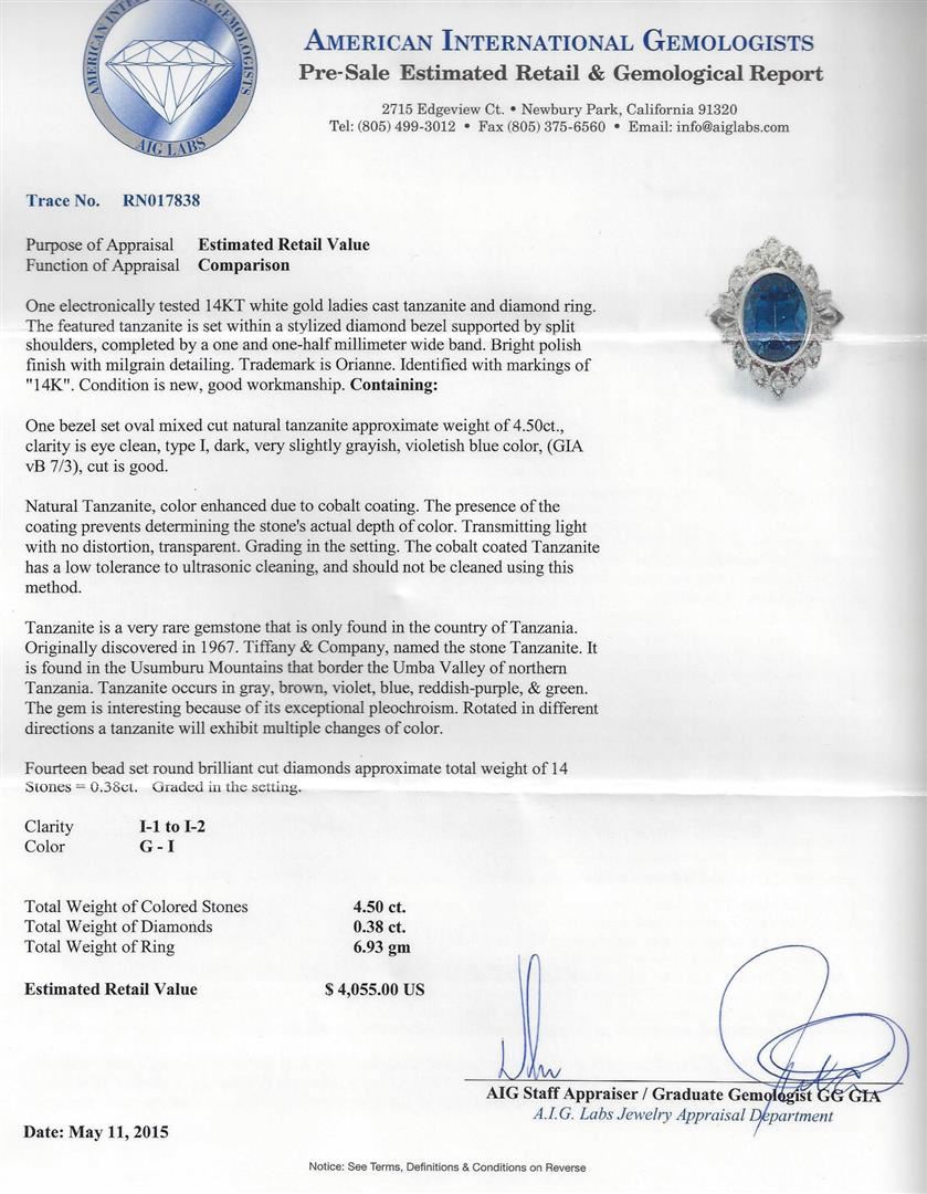 One electronically tested white gold ladies cast tanzanite and diamond ring. Condition is new, good workmanship. The featured tanzanite is set within a stylized diamond bezel supported by split shoulders, completed by a one and one-half millimeter wide band. Bright polish finish with milgrain detailing. Trademark is Orianne. Identified with markings of" 14K". Containing: One bezel set oval mixed cut natural tanzanite approximate weight of 4.50ct., clarity is eye clean, type I, dark, very slightly grayish, violetish blue color, (GIA vB 7/3), cut is good. Natural Tanzanite, color enhanced due to cobalt coating. The presence of the coating prevents determining the stone's actual depth of color. Transmitting light with no distortion, transparent. Grading in the setting. The cobalt coated Tanzanite has a low tolerance to ultrasonic cleaning, and should not be cleaned using this method. Tanzanite is a very rare gemstone that is only found in the country of Tanzania. Originally discovered in 1967.Tiffany & Company, named the stone Tanzanite. It is found in the Usumburu Mountains that border the Umba Valley of northern Tanzania. Tanzanite occurs in gray, brown, violet, blue, reddish-purple, & green. The gem is interesting because of its exceptional pleochroism. Rotated in different directions a tanzanite will exhibit multiple changes of color. Fourteen bead set round brilliant cut diamonds approximate total weight of 14 Stones = 0.38ct. Graded in the setting. Clarity: I-1 to I-2.Color: G - I. AIG Appraised at $4,055.00.