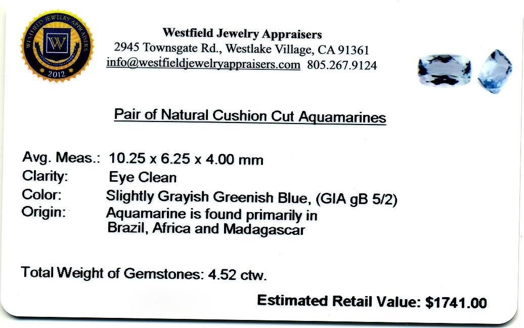 4.52cts Cushion Cut Pair of Natural Cushion Cut Aquamarines. Westfield Appraised at $1,741.00.