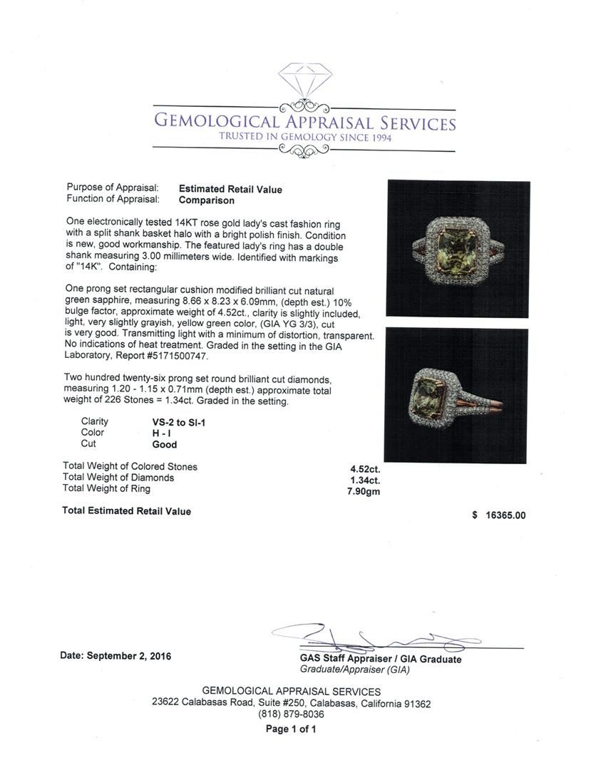One electronically tested 14KT rose gold lady's cast fashion ring with a split shank basket halo with a bright polish finish. The featured lady's ring has a double shank measuring 3.00 millimeters wide. Identified with markings of '14K'. Condition is new, good workmanship. Containing: One prong set rectangular cushion modified brilliant cut natural green sapphire, measuring 8.66 x 8.23 x 6.09mm, (depth est.) 10%. bulge factor, approximate weight of 4.52ct., clarity is slightly included, light, very slightly grayish, yellow green color, (GIA YG 3/3), cut is very good. Transmitting light with a minimum of distortion, transparent. No indications of heat treatment. Graded in the setting in the GIA Laboratory, Report #5171500747. Two Hundred Twenty-Six prong set round brilliant cut diamonds, measuring 1.20 - 1.15 x 0.71mm (depth est.) approximate total weight of 226 Stones = 1.34ct. Graded in the setting. Clarity VS-2 to SI-1. Color: H - I Cut Good. Total Weight of Colored Stones 4.52ct.. Total Weight of Diamonds 1.34ct.. Total Weight of Ring 7.90gm GAS Appraised at $16,365.00.