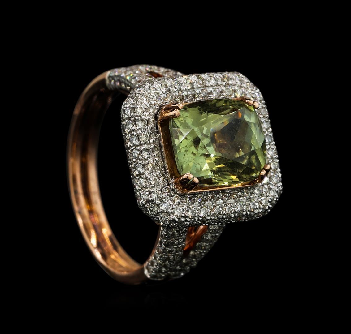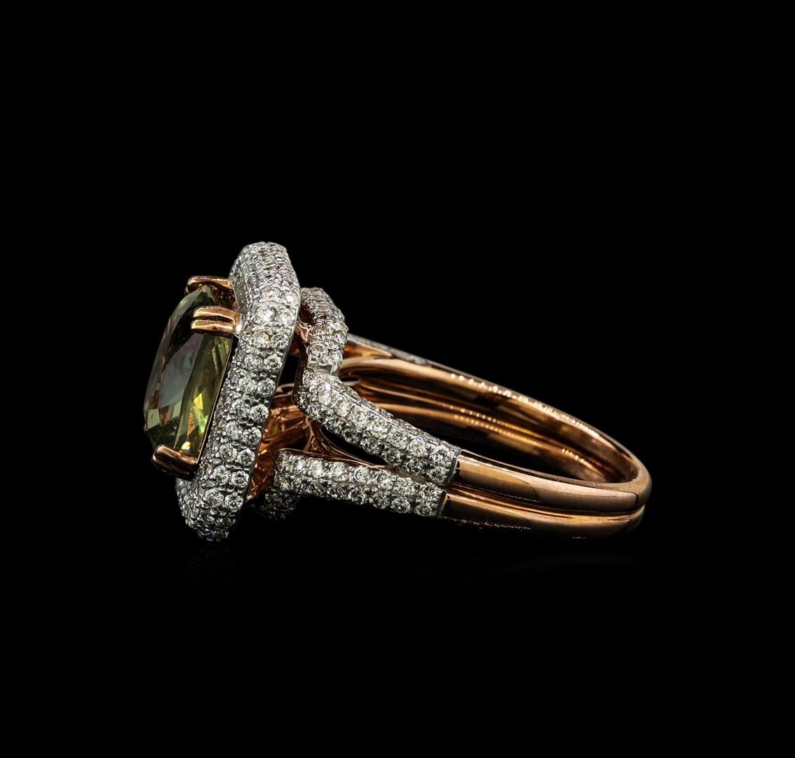 One electronically tested 14KT rose gold lady's cast fashion ring with a split shank basket halo with a bright polish finish. The featured lady's ring has a double shank measuring 3.00 millimeters wide. Identified with markings of '14K'. Condition is new, good workmanship. Containing: One prong set rectangular cushion modified brilliant cut natural green sapphire, measuring 8.66 x 8.23 x 6.09mm, (depth est.) 10%. bulge factor, approximate weight of 4.52ct., clarity is slightly included, light, very slightly grayish, yellow green color, (GIA YG 3/3), cut is very good. Transmitting light with a minimum of distortion, transparent. No indications of heat treatment. Graded in the setting in the GIA Laboratory, Report #5171500747. Two Hundred Twenty-Six prong set round brilliant cut diamonds, measuring 1.20 - 1.15 x 0.71mm (depth est.) approximate total weight of 226 Stones = 1.34ct. Graded in the setting. Clarity VS-2 to SI-1. Color: H - I Cut Good. Total Weight of Colored Stones 4.52ct.. Total Weight of Diamonds 1.34ct.. Total Weight of Ring 7.90gm GAS Appraised at $16,365.00.