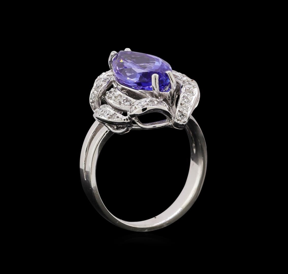 One electronically tested 14KT white gold lady's cast fashion ring with a freeform motif with a bright polish finish. The featured lady's ring has a shank measuring 3.40 millimeters in width. Identified with markings of 'K14'. Condition is new, good workmanship. Containing: One prong set marquise modified brilliant cut natural tanzanite, measuring 15.58 x 7.65 x 4.97mm, (depth est.) 15%. bulge factor, approximate weight of 4.52ct., clarity is eye clean, light, moderately strong, bluish violet color, (GIA bV 3/4), cut is good. Graded in the setting. Forty-Six prong set round brilliant cut diamonds, measuring 1.35 - 1.30 x 0.82mm (depth est.) approximate total weight of 46 Stones = 0.40ct. Graded in the setting. Clarity SI-1 to SI-2. Color: H - I Cut Good. Total Weight of Colored Stones 4.52ct.. Total Weight of Diamonds 0.40ct.. Total Weight of Ring 7.50gm. GAS Appraised at $6,815.00.