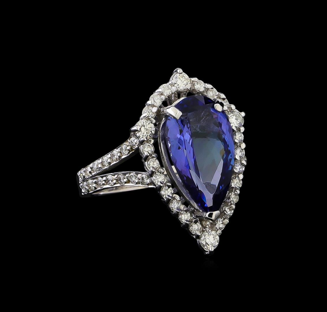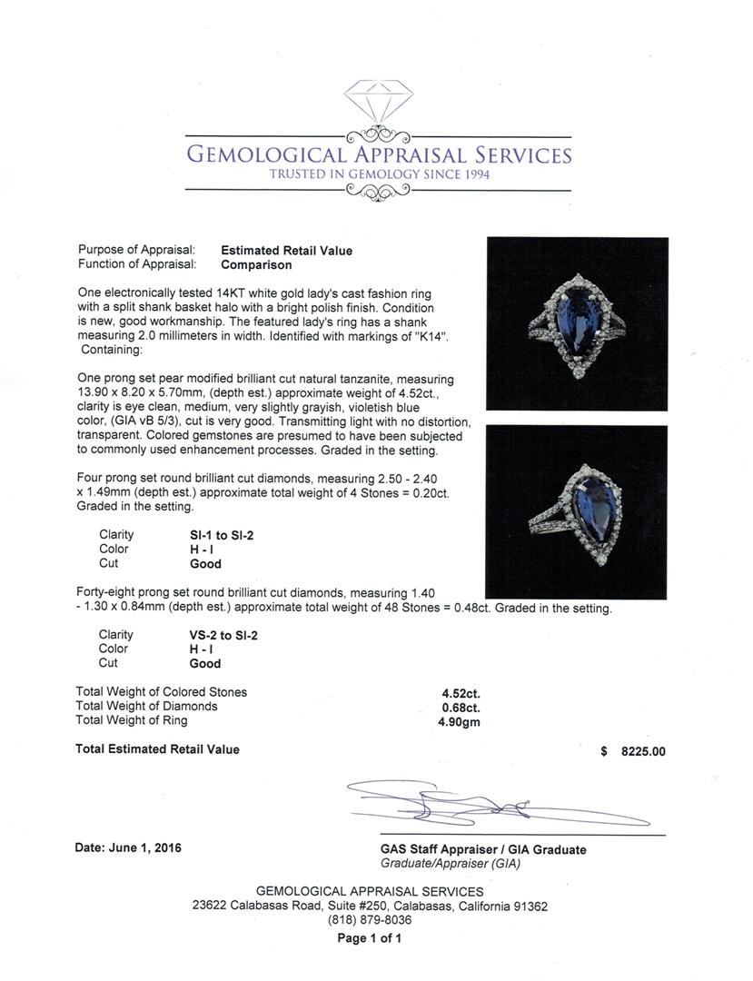 One electronically tested 14KT white gold lady's cast fashion ring with a split shank basket halo with a bright polish finish. The featured lady's ring has a shank measuring 2.0 millimeters in width. Identified with markings of "K14". Condition is new, good workmanship. Containing: One prong set pear modified brilliant cut natural tanzanite, measuring 13.90 x 8.20 x 5.70mm, (depth est.) approximate weight of 4.52ct., clarity is eye clean, medium, very slightly grayish, violetish blue color, (GIA vB 5/3), cut is very good. Transmitting light with no distortion, transparent. Colored gemstones are presumed to have been subjected to commonly used enhancement processes. Graded in the setting. Four prong set round brilliant cut diamonds, measuring 2.50 - 2.40 x 1.49mm (depth est.) approximate total weight of 4 Stones = 0.20ct. Graded in the setting. Clarity: SI-1 to SI-2. Color: H - I. Cut Good Forty-Eight prong set round brilliant cut diamonds, measuring 1.40 - 1.30 x 0.84mm (depth est.) approximate total weight of 48 Stones = 0.48ct. Graded in the setting. Clarity: VS-2 to SI-2. Color: H - I. Cut Good. Total Weight of Colored Stones 4.52ct. Total Weight of Diamonds 0.68ct. Total Weight of Ring 4.90gm. GAS Appraised at $8,225.00.