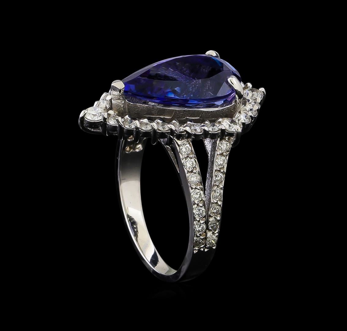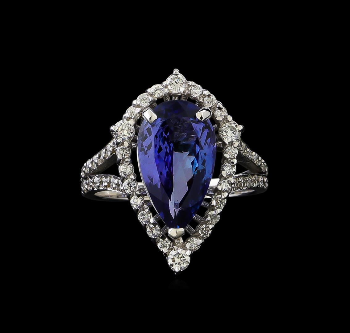 One electronically tested 14KT white gold lady's cast fashion ring with a split shank basket halo with a bright polish finish. The featured lady's ring has a shank measuring 2.0 millimeters in width. Identified with markings of "K14". Condition is new, good workmanship. Containing: One prong set pear modified brilliant cut natural tanzanite, measuring 13.90 x 8.20 x 5.70mm, (depth est.) approximate weight of 4.52ct., clarity is eye clean, medium, very slightly grayish, violetish blue color, (GIA vB 5/3), cut is very good. Transmitting light with no distortion, transparent. Colored gemstones are presumed to have been subjected to commonly used enhancement processes. Graded in the setting. Four prong set round brilliant cut diamonds, measuring 2.50 - 2.40 x 1.49mm (depth est.) approximate total weight of 4 Stones = 0.20ct. Graded in the setting. Clarity: SI-1 to SI-2. Color: H - I. Cut Good Forty-Eight prong set round brilliant cut diamonds, measuring 1.40 - 1.30 x 0.84mm (depth est.) approximate total weight of 48 Stones = 0.48ct. Graded in the setting. Clarity: VS-2 to SI-2. Color: H - I. Cut Good. Total Weight of Colored Stones 4.52ct. Total Weight of Diamonds 0.68ct. Total Weight of Ring 4.90gm. GAS Appraised at $8,225.00.