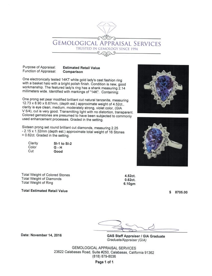 One electronically tested 14KT white gold lady's cast fashion ring with a basket halo with a bright polish finish. The featured lady's ring has a shank measuring 2.14 millimeters wide. Identified with markings of '14K'. Condition is new, good workmanship. Containing: One prong set pear modified brilliant cut natural tanzanite, measuring 12.73 x 8.90 x 6.67mm, (depth est.) approximate weight of 4.52ct., clarity is eye clean, medium, moderately strong, violet color, (GIA V 5/4), cut is very good. Transmitting light with no distortion, transparent. Colored gemstones are presumed to have been subjected to commonly used enhancement processes. Graded in the setting. Sixteen prong set round brilliant cut diamonds, measuring 2.25 - 2.15 x 1.32mm (depth est.) approximate total weight of 16 Stones = 0.62ct. Graded in the setting. Clarity SI-1 to SI-2. Color: G - H Cut Good. Total Weight of Colored Stones 4.52ct.. Total Weight of Diamonds 0.62ct.. Total Weight of Ring 6.10gm GAS Appraised at $8,705.00.