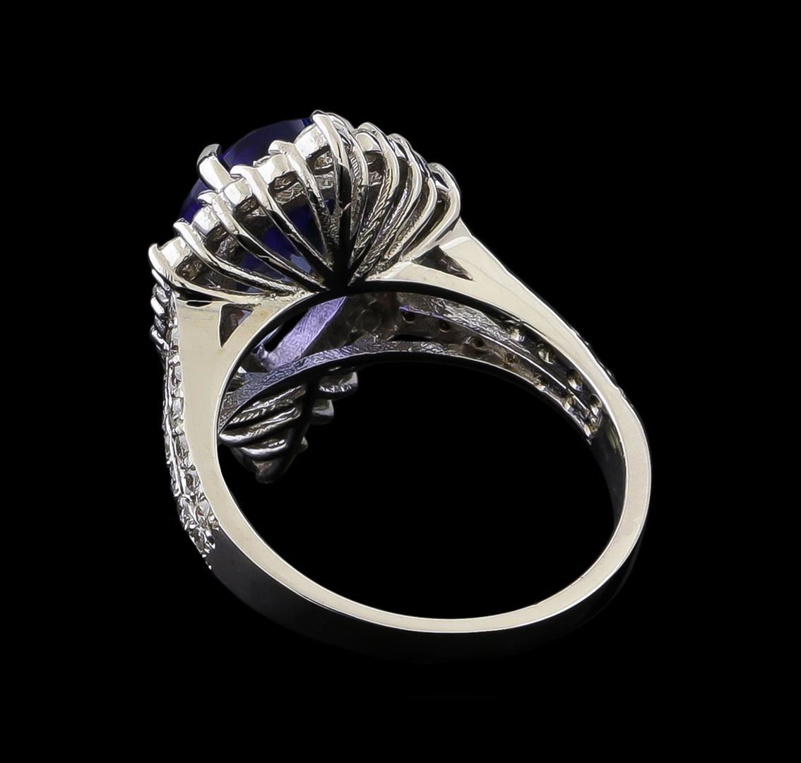 One electronically tested 14KT white gold lady's cast fashion ring with a split shank basket halo with a bright polish finish. The featured lady's ring has a shank measuring 2.0 millimeters in width. Identified with markings of "K14". Condition is new, good workmanship. Containing: One prong set pear modified brilliant cut natural tanzanite, measuring 13.90 x 8.20 x 5.70mm, (depth est.) approximate weight of 4.52ct., clarity is eye clean, medium, very slightly grayish, violetish blue color, (GIA vB 5/3), cut is very good. Transmitting light with no distortion, transparent. Colored gemstones are presumed to have been subjected to commonly used enhancement processes. Graded in the setting. Four prong set round brilliant cut diamonds, measuring 2.50 - 2.40 x 1.49mm (depth est.) approximate total weight of 4 Stones = 0.20ct. Graded in the setting. Clarity: SI-1 to SI-2. Color: H - I. Cut Good Forty-Eight prong set round brilliant cut diamonds, measuring 1.40 - 1.30 x 0.84mm (depth est.) approximate total weight of 48 Stones = 0.48ct. Graded in the setting. Clarity: VS-2 to SI-2. Color: H - I. Cut Good. Total Weight of Colored Stones 4.52ct. Total Weight of Diamonds 0.68ct. Total Weight of Ring 4.90gm. GAS Appraised at $8,225.00.