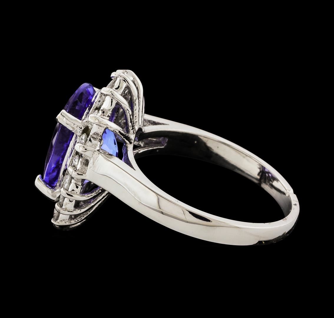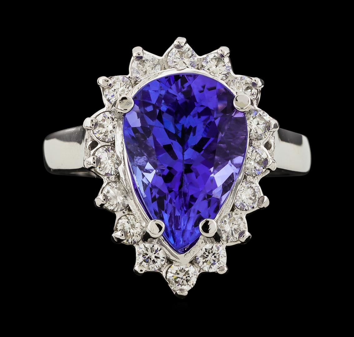 One electronically tested 14KT white gold lady's cast fashion ring with a basket halo with a bright polish finish. The featured lady's ring has a shank measuring 2.14 millimeters wide. Identified with markings of '14K'. Condition is new, good workmanship. Containing: One prong set pear modified brilliant cut natural tanzanite, measuring 12.73 x 8.90 x 6.67mm, (depth est.) approximate weight of 4.52ct., clarity is eye clean, medium, moderately strong, violet color, (GIA V 5/4), cut is very good. Transmitting light with no distortion, transparent. Colored gemstones are presumed to have been subjected to commonly used enhancement processes. Graded in the setting. Sixteen prong set round brilliant cut diamonds, measuring 2.25 - 2.15 x 1.32mm (depth est.) approximate total weight of 16 Stones = 0.62ct. Graded in the setting. Clarity SI-1 to SI-2. Color: G - H Cut Good. Total Weight of Colored Stones 4.52ct.. Total Weight of Diamonds 0.62ct.. Total Weight of Ring 6.10gm GAS Appraised at $8,705.00.