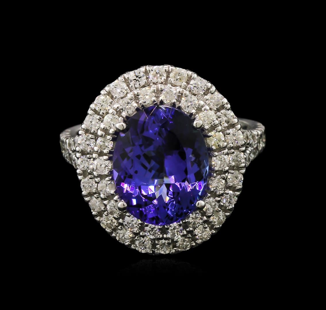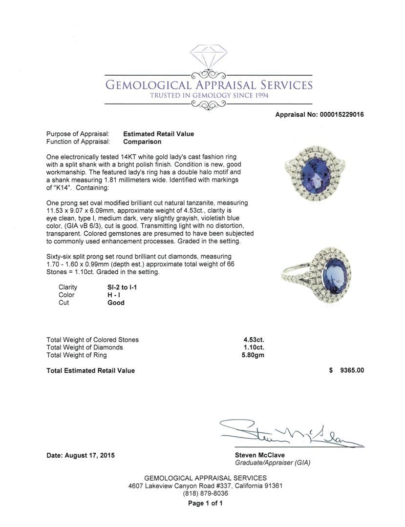 One electronically tested 14KT white gold lady's cast fashion ring with a split shank with a bright polish finish. The featured lady's ring has a double halo motif and a shank measuring 1.81 millimeters wide. Identified with markings of "K14". Condition is new, good workmanship. Containing: One prong set oval modified brilliant cut natural tanzanite, measuring 11.53 x 9.07 x 6.09mm, approximate weight of 4.53ct., clarity is eye clean, type I, medium dark, very slightly grayish, violetish blue color, (GIA vB 6/3), cut is good. Transmitting light with no distortion, transparent. Colored gemstones are presumed to have been subjected to commonly used enhancement processes. Graded in the setting. Sixty-Six split prong set round brilliant cut diamonds, measuring 1.70 - 1.60 x 0.99mm (depth est.) approximate total weight of 66 Stones = 1.10ct. Graded in the setting. Clarity: SI-2 to I-1. Color: H - I. Cut Good. Total Weight of Colored Stones 4.53ct. Total Weight of Diamonds 1.10ct. Total Weight of Ring 5.80gm. GAS Appraised at $9,365.00.