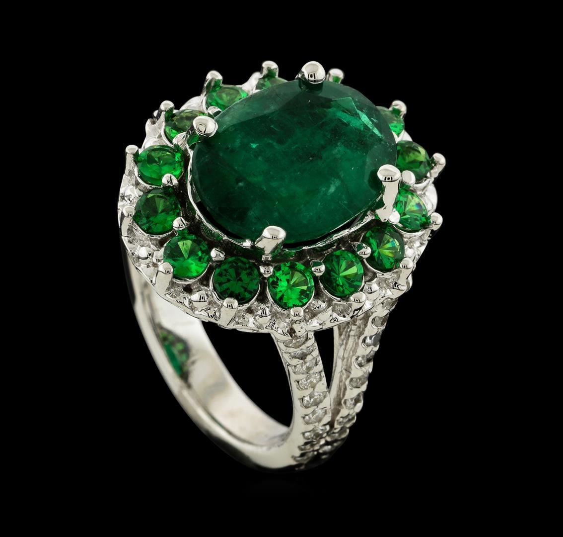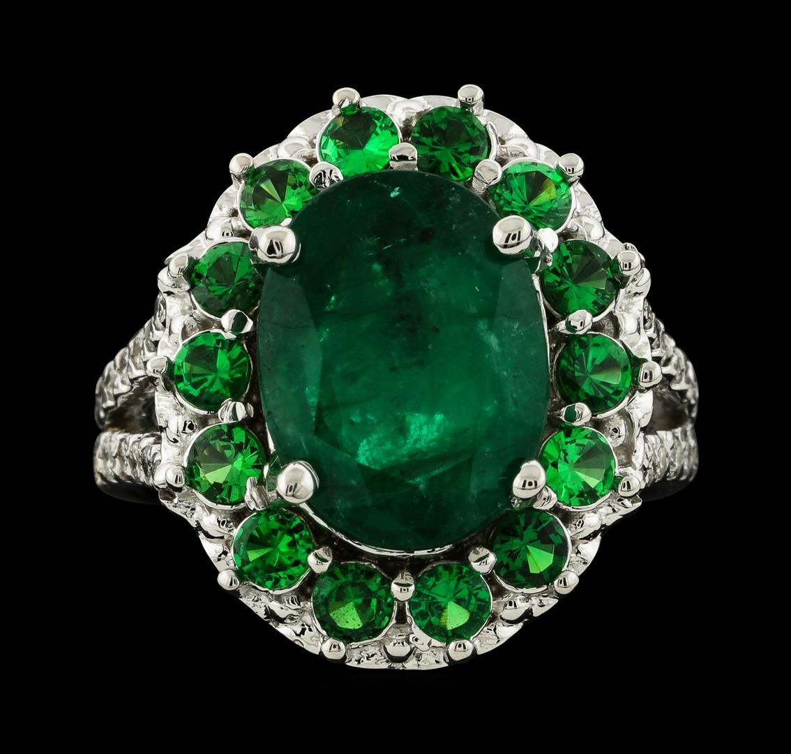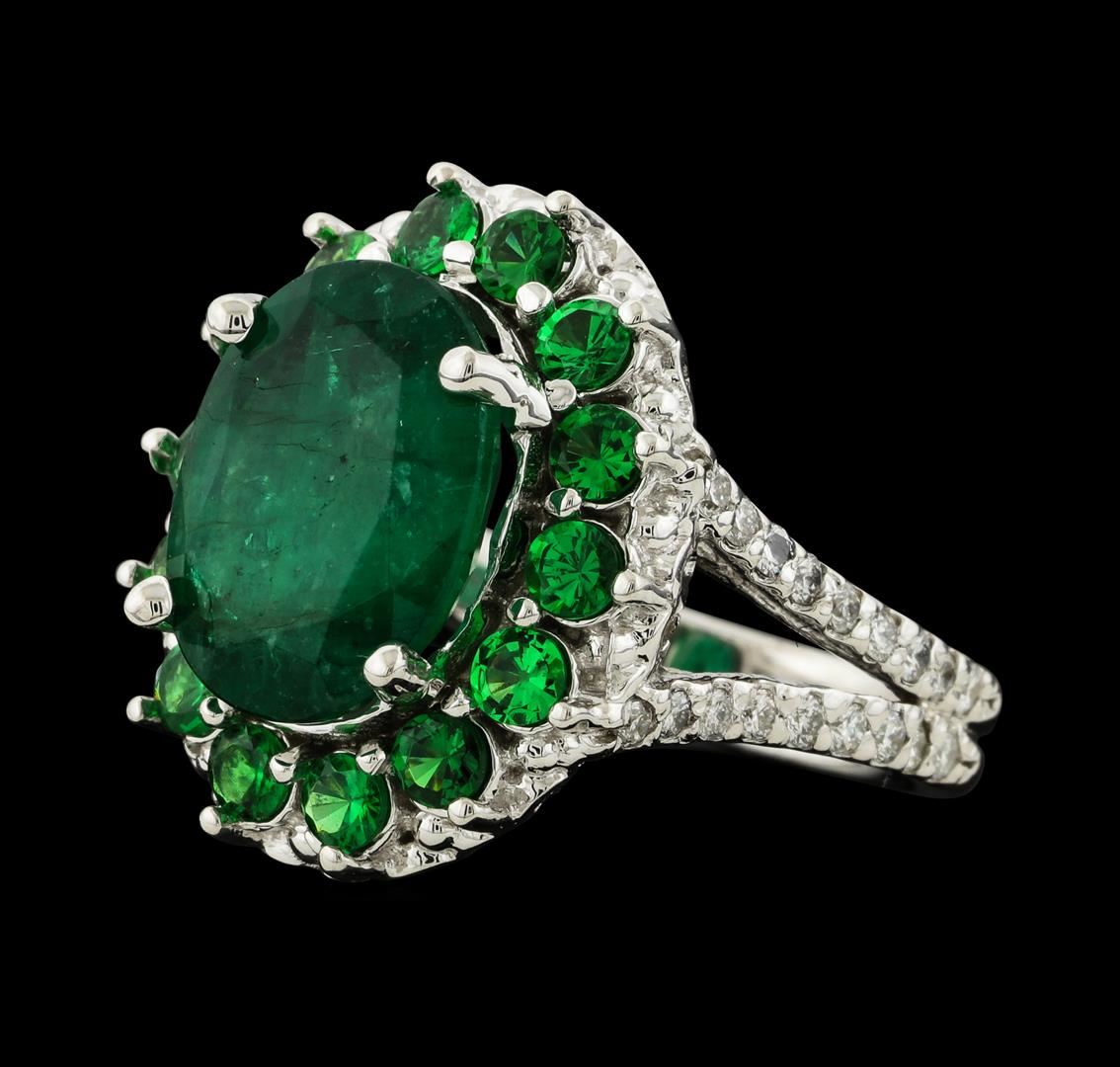 One electronically tested 14KT white gold lady's cast fashion ring with a split shank basket halo with a bright polish finish. The featured lady's ring has a double shank measuring 3.34 millimeters wide. Identified with markings of '14K'. Condition is new, good workmanship. Containing: One prong set oval modified mixed cut natural emerald, measuring 12.80 x 9.65 x 5.45mm, (depth est.) 15%. bulge factor, approximate weight of 4.54ct., clarity is heavily included, medium dark, moderately strong, green color, (GIA G 6/4), cut is good. Transmitting light somewhat diffusely, semi-transparent to translucent. Indications of oil residue. Naturally occurring internal & external characteristics are present. Colored gemstones are presumed to have been subjected to commonly used enhancement processes. Graded in the setting. Fourteen prong set round modified brilliant cut natural tsavorite garnets, measuring 2.60 - 2.50 x 1.67 mm, (depth est.) approximate total weight of 1.15ct., clarity is eye clean, medium, moderately strong, slightly yellowish green color, (GIA slyG 5/4), cut is good. Transmitting light with no distortion, transparent. Colored gemstones are presumed to have been subjected to commonly used enhancement processes. Graded in the setting. Thirty-Six prong set round brilliant cut diamonds, measuring 1.50 - 1.40 x 0.90mm (depth est.) approximate total weight of 36 Stones = 0.42ct. Graded in the setting. Clarity SI-1 to SI-3. Color: G - I Cut Good. Total Weight of Colored Stones 5.69ct.. Total Weight of Diamonds 0.42ct.. Total Weight of Ring 9.10gm. GAS Appraised at $6,690.00.