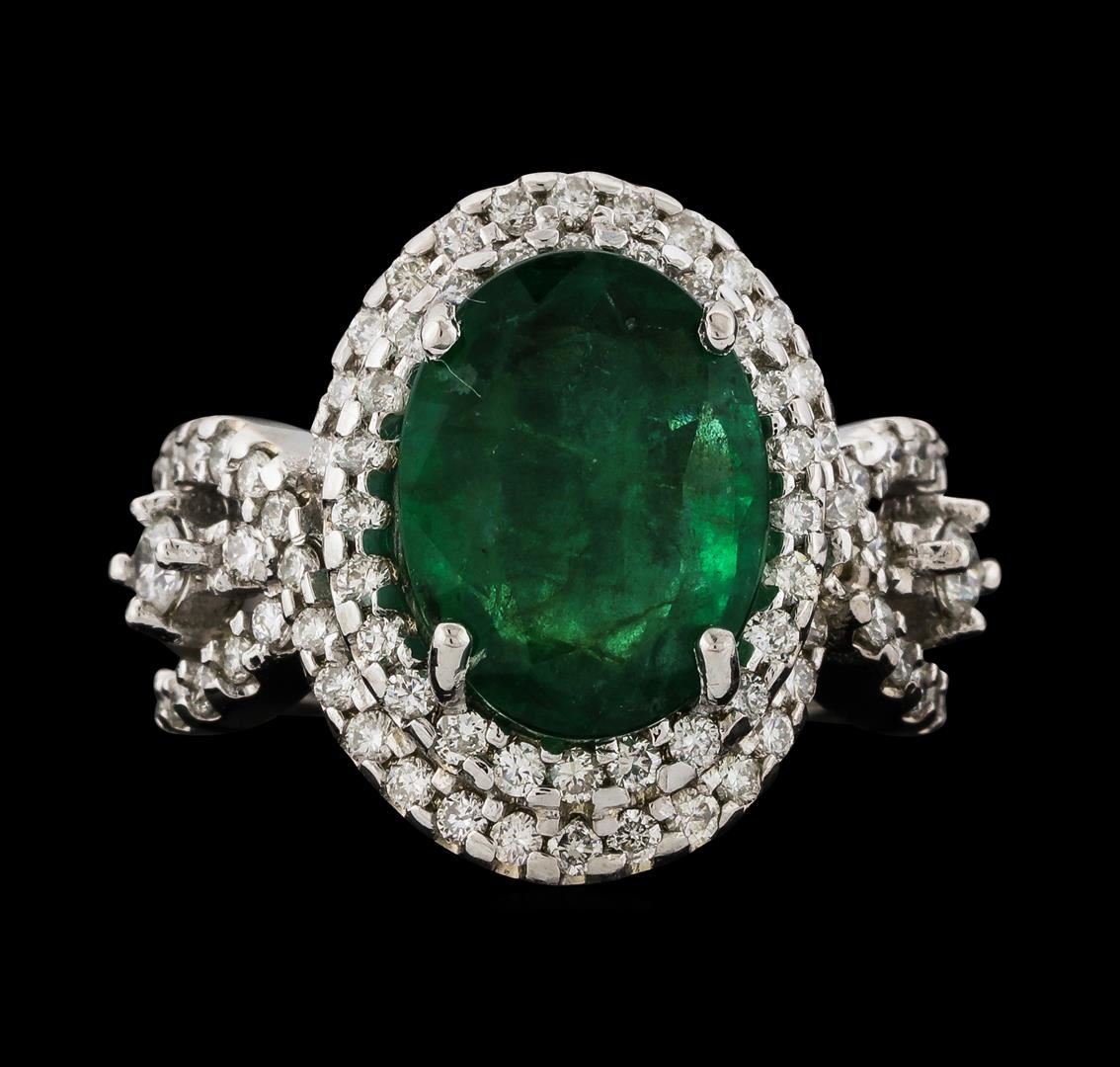 One electronically tested 14KT white gold lady's cast fashion ring with a triple split crossover shank with a bright polish finish. The featured lady's ring has a shank measuring 2.60 millimeters wide. Identified with markings of 'K14'. Condition is new, good workmanship. Containing: One prong set oval modified mixed cut natural emerald, measuring 12.65 x 9.50 x 5.50mm, (depth est.) 20%. bulge factor, approximate weight of 4.54ct., clarity is heavily included, medium, moderately strong, green color, (GIA G 5/4), cut is good. Transmitting light somewhat diffusely, semi-transparent to translucent. Naturally occurring internal & external characteristics are present. Indications of oil residue. Colored gemstones are presumed to have been subjected to commonly used enhancement processes. Graded in the setting. Two prong set round brilliant cut diamonds, measuring 2.70 - 2.60 x 1.64mm (depth est.) approximate total weight of 2 Stones = 0.14ct. Graded in the setting. Clarity SI-2. Color: H Cut Good Eighty-Four prong set round brilliant cut diamonds, measuring 1.50 - 1.40 x 0.90mm (depth est.) approximate total weight of 84 Stones = 1.00ct. Graded in the setting. Clarity SI-1 to SI-2. Color: G - H Cut Good. Total Weight of Colored Stones 4.54ct.. Total Weight of Diamonds 1.14ct.. Total Weight of Ring 7.60gm. GAS Appraised at $8,930.00.