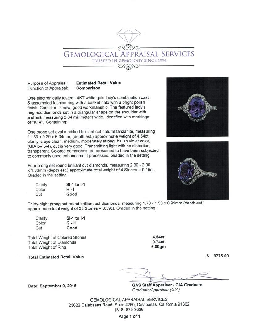 One electronically tested 14KT white gold lady's combination cast & assembled fashion ring with a basket halo with a bright polish finish. The featured lady's ring has diamonds set in a triangular shape on the shoulder with a shank measuring 2.64 millimeters wide. Identified with markings of 'K14'. Condition is new, good workmanship. Containing: One prong set oval modified brilliant cut natural tanzanite, measuring 11.33 x 9.29 x 6.04mm, (depth est.) approximate weight of 4.54ct., clarity is eye clean, medium, moderately strong, bluish violet color, (GIA bV 5/4), cut is very good. Transmitting light with no distortion, transparent. Colored gemstones are presumed to have been subjected to commonly used enhancement processes. Graded in the setting. Four prong set round brilliant cut diamonds, measuring 2.30 - 2.00 x 1.33mm (depth est.) approximate total weight of 4 Stones = 0.15ct. Graded in the setting. Clarity SI-1 to I-1. Color: H - I Cut Good Thirty-Eight prong set round brilliant cut diamonds, measuring 1.70 - 1.50 x 0.99mm (depth est.) approximate total weight of 38 Stones = 0.59ct. Graded in the setting. Clarity SI-1 to I-1. Color: G - H Cut Good. Total Weight of Colored Stones 4.54ct.. Total Weight of Diamonds 0.74ct.. Total Weight of Ring 6.00gm GAS Appraised at $9,775.00.