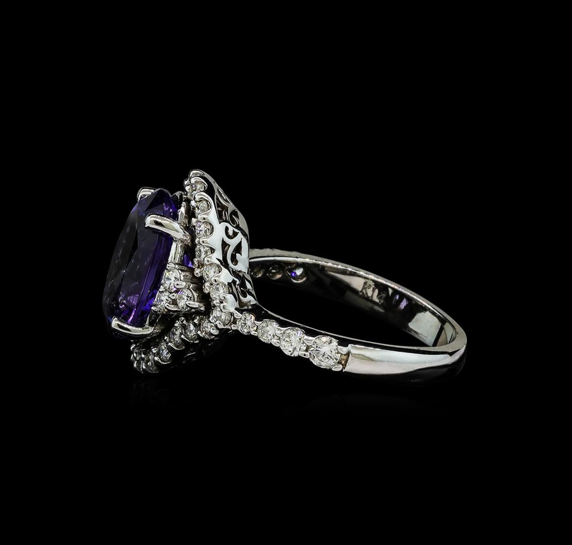 One electronically tested 14KT white gold lady's combination cast & assembled fashion ring with a basket halo with a bright polish finish. The featured lady's ring has diamonds set in a triangular shape on the shoulder with a shank measuring 2.64 millimeters wide. Identified with markings of 'K14'. Condition is new, good workmanship. Containing: One prong set oval modified brilliant cut natural tanzanite, measuring 11.33 x 9.29 x 6.04mm, (depth est.) approximate weight of 4.54ct., clarity is eye clean, medium, moderately strong, bluish violet color, (GIA bV 5/4), cut is very good. Transmitting light with no distortion, transparent. Colored gemstones are presumed to have been subjected to commonly used enhancement processes. Graded in the setting. Four prong set round brilliant cut diamonds, measuring 2.30 - 2.00 x 1.33mm (depth est.) approximate total weight of 4 Stones = 0.15ct. Graded in the setting. Clarity SI-1 to I-1. Color: H - I Cut Good Thirty-Eight prong set round brilliant cut diamonds, measuring 1.70 - 1.50 x 0.99mm (depth est.) approximate total weight of 38 Stones = 0.59ct. Graded in the setting. Clarity SI-1 to I-1. Color: G - H Cut Good. Total Weight of Colored Stones 4.54ct.. Total Weight of Diamonds 0.74ct.. Total Weight of Ring 6.00gm GAS Appraised at $9,775.00.