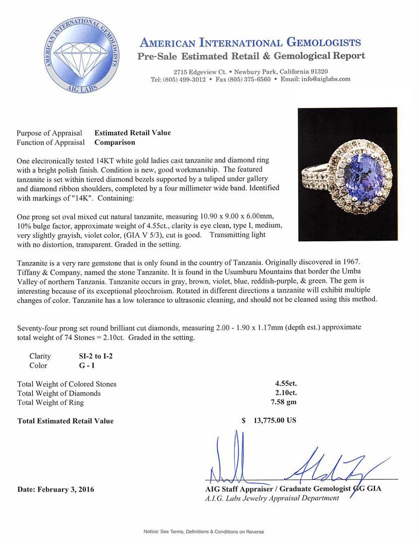 One electronically tested 14KT white gold ladies cast tanzanite and diamond ring with a bright polish finish. The featured tanzanite is set within tiered diamond bezels supported by a tuliped under gallery and diamond ribbon shoulders, completed by a four millimeter wide band. Identified with markings of "14K". Condition is new, good workmanship. Containing: One prong set oval mixed cut natural tanzanite, measuring 10.90 x 9.00 x 6.00mm, 10%. bulge factor, approximate weight of 4.55ct., clarity is eye clean, type I, medium, very slightly grayish, violet color, (GIA V 5/3), cut is good. Transmitting light with no distortion, transparent. Graded in the setting. Tanzanite is a very rare gemstone that is only found in the country of Tanzania. Originally discovered in 1967. Tiffany & Company, named the stone Tanzanite. It is found in the Usumburu Mountains that border the Umba Valley of northern Tanzania. Tanzanite occurs in gray, brown, violet, blue, reddish-purple, & green. The gem is interesting because of its exceptional pleochroism. Rotated in different directions a tanzanite will exhibit multiple changes of color. Tanzanite has a low tolerance to ultrasonic cleaning, and should not be cleaned using this method. Seventy-Four prong set round brilliant cut diamonds, measuring 2.00 - 1.90 x 1.17mm (depth est.) approximate total weight of 74 Stones = 2.10ct. Graded in the setting. Clarity: SI-2 to I-2. Color: G - I. Total Weight of Colored Stones 4.55ct. Total Weight of Diamonds 2.10ct. Total Weight of Ring 7.58gm. AIG Appraised at $13,775.00.