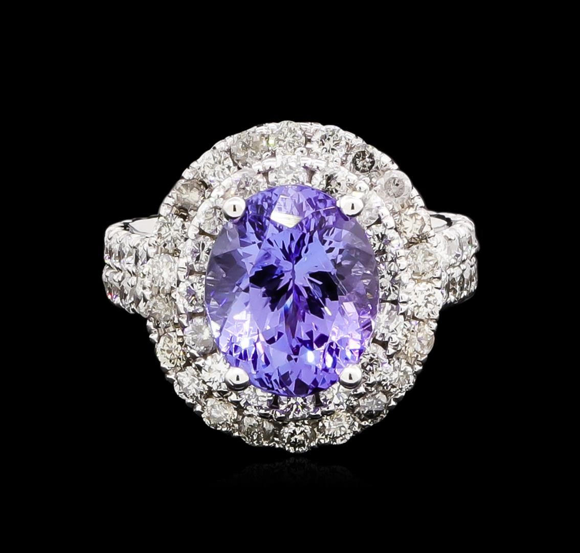 One electronically tested 14KT white gold ladies cast tanzanite and diamond ring with a bright polish finish. The featured tanzanite is set within tiered diamond bezels supported by a tuliped under gallery and diamond ribbon shoulders, completed by a four millimeter wide band. Identified with markings of "14K". Condition is new, good workmanship. Containing: One prong set oval mixed cut natural tanzanite, measuring 10.90 x 9.00 x 6.00mm, 10%. bulge factor, approximate weight of 4.55ct., clarity is eye clean, type I, medium, very slightly grayish, violet color, (GIA V 5/3), cut is good. Transmitting light with no distortion, transparent. Graded in the setting. Tanzanite is a very rare gemstone that is only found in the country of Tanzania. Originally discovered in 1967. Tiffany & Company, named the stone Tanzanite. It is found in the Usumburu Mountains that border the Umba Valley of northern Tanzania. Tanzanite occurs in gray, brown, violet, blue, reddish-purple, & green. The gem is interesting because of its exceptional pleochroism. Rotated in different directions a tanzanite will exhibit multiple changes of color. Tanzanite has a low tolerance to ultrasonic cleaning, and should not be cleaned using this method. Seventy-Four prong set round brilliant cut diamonds, measuring 2.00 - 1.90 x 1.17mm (depth est.) approximate total weight of 74 Stones = 2.10ct. Graded in the setting. Clarity: SI-2 to I-2. Color: G - I. Total Weight of Colored Stones 4.55ct. Total Weight of Diamonds 2.10ct. Total Weight of Ring 7.58gm. AIG Appraised at $13,775.00.