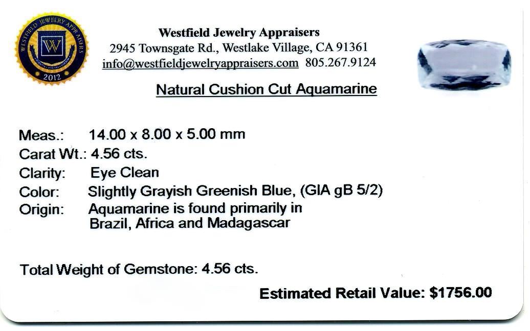 4.56ct Cushion Cut Natural Cushion Cut Aquamarine. Westfield Appraised at $1,756.00.