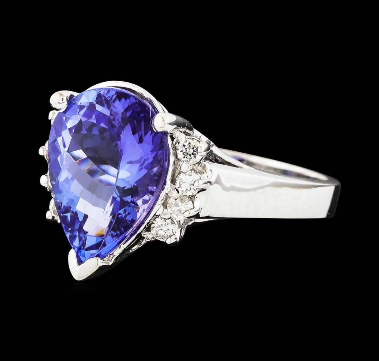 One electronically tested 14KT white gold lady's cast fashion ring with a cathedral shank with a bright polish finish. The featured lady's ring has diamond set shoulders and a shank measuring 2.55 millimeters wide. Identified with markings of '14K'. Condition is new, good workmanship. Containing: One prong set pear modified brilliant cut natural tanzanite, measuring 12.90 x 9.58 x 6.03mm, (depth est.) approximate weight of 4.56ct., clarity is eye clean, medium, moderately strong, bluish violet color, (GIA bV 5/4), cut is good. Transmitting light with no distortion, transparent. Colored gemstones are presumed to have been subjected to commonly used enhancement processes. Graded in the setting. Eight prong set round brilliant cut diamonds, measuring 2.00 - 1.90 x 1.21mm (depth est.) approximate total weight of 8 Stones = 0.23ct. Graded in the setting. Clarity SI-1 to I-1. Color: H - I Cut Good. Total Weight of Colored Stones 4.56ct.. Total Weight of Diamonds 0.23ct.. Total Weight of Ring 5.50gm.