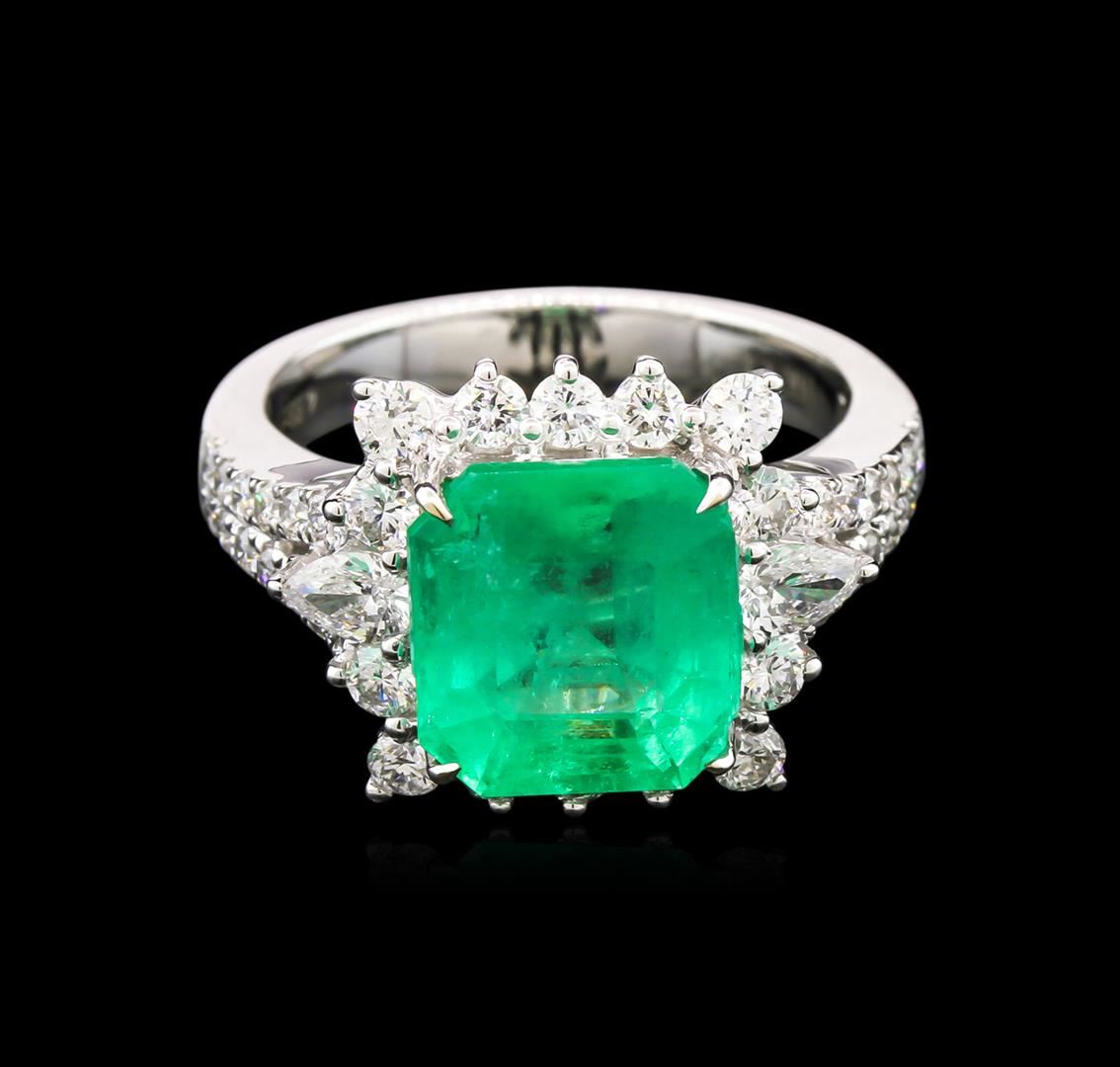 One electronically tested 18KT white gold lady's cast fashion ring with a basket halo with a bright polish finish. The featured lady's ring has a shank measuring 3.35 millimeters wide. Trademark is CJ. Identified with markings of "18K". Condition is new, good workmanship. Containing: One prong set square step cut natural emerald, measuring 9.86 x 9.48 x 6.90mm, 4% bulge factor, approximate weight of 4.56ct., clarity is moderately included, type III, medium, very slightly grayish, green color, (GIA G 5/3), cut is good. Transmitting light somewhat diffusely, transparent to translucent. Naturally occurring internal & external characteristics are present. Indications of oil residue. Graded in the setting. Two prong set pear shaped cut diamonds, measuring 4.25 x 2.70 x 1.78mm (depth est.) approximate total weight of 2 Stones = 0.26ct. Graded in the setting. Clarity: VS-2 to SI-1. Color: G - Very Good Fourteen prong set round brilliant cut diamonds, measuring 2.30 - 2.20 x 1.46mm (depth est.) approximate total weight of 14 Stones = 0.66ct. Graded in the setting. Clarity: SI-1 to SI-2. Color: H - I. Cut Good Twenty-Four prong set round brilliant cut diamonds, measuring 1.40 - 1.35 x 0.88mm (depth est.) approximate total weight of 24 Stones = 0.24ct. Graded in the setting. Clarity: SI-1 to I-1. Color: H - J. Cut Good. Total Weight of Colored Stones 4.56ct. Total Weight of Diamonds 1.16ct. Total Weight of Ring 7.70gm. GAS Appraised at $11,520.00.
