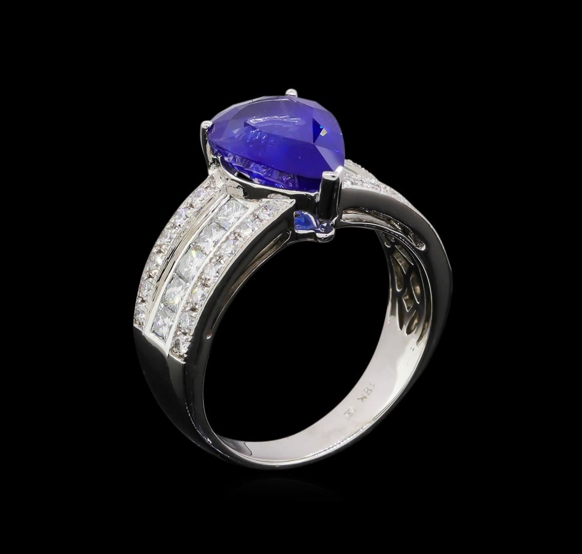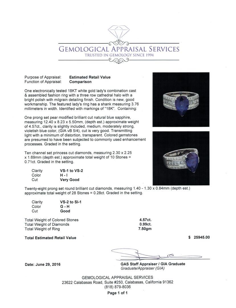One electronically tested 18KT white gold lady's combination cast & assembled fashion ring with a three row cathedral halo with a bright polish with milgrain detailing finish. The featured lady's ring has a shank measuring 3.76 millimeters in width. Identified with markings of "18K". Condition is new, good workmanship. Containing: One prong set pear modified brilliant cut natural blue sapphire, measuring 12.40 x 8.23 x 5.50mm, (depth est.) approximate weight of 4.57ct., clarity is slightly included, medium, moderately strong, violetish blue color, (GIA vB 5/4), cut is very good. Transmitting light with a minimum of distortion, transparent. Colored gemstones are presumed to have been subjected to commonly used enhancement processes. Graded in the setting. Ten channel set princess cut diamonds, measuring 2.30 x 2.25 x 1.69mm (depth est.) approximate total weight of 10 Stones = 0.71ct. Graded in the setting. Clarity: VS-1 to VS-2. Color: H - I. Cut Very Good Twenty-Eight prong set round brilliant cut diamonds, measuring 1.40 - 1.30 x 0.84mm (depth est.) approximate total weight of 28 Stones = 0.28ct. Graded in the setting. Clarity: VS-2 to SI-1. Color: G - Good. Total Weight of Colored Stones 4.57ct. Total Weight of Diamonds 0.99ct. Total Weight of Ring 7.50gm. GAS Appraised at $25,945.00.