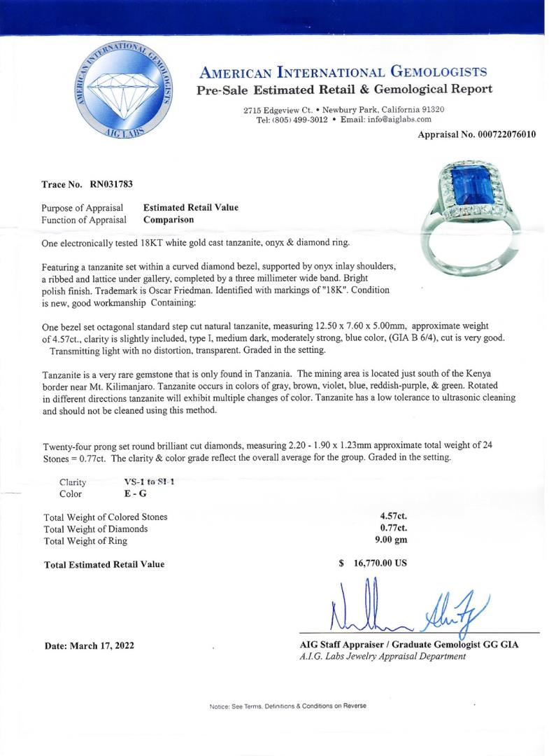 One electronically tested 18KT white gold cast tanzanite, onyx & diamond ring. Featuring a tanzanite set within a curved diamond bezel, supported by onyx inlay shoulders, a ribbed and lattice under gallery, completed by a three millimeter wide band. Bright polish finish. Trademark is Oscar Friedman. Identified with markings of "18K". Condition is new, good workmanship. One bezel set octagonal standard step cut natural tanzanite, measuring 12.50 x 7.60 x 5.00mm, approximate weight of 4.57ct., clarity is slightly included, type I, medium dark, moderately strong, blue color, (GIA B 6/4), cut is very good. Transmitting light with no distortion, transparent. Graded in the setting. Tanzanite is a very rare gemstone that is only found in Tanzania. The mining area is located just south of the Kenya border near Mt. Kilimanjaro. Tanzanite occurs in colors of gray, brown, violet, blue, reddish-purple, & green. Rotated in different directions tanzanite will exhibit multiple changes of color. Tanzanite has a low tolerance to ultrasonic cleaning and should not be cleaned using this method. Twenty-four prong set round brilliant cut diamonds, measuring 2.20 - 1.90 x 1.23mm approximate total weight of 24 Stones = 0.77ct. The clarity & color grade reflect the overall average for the group. Graded in the setting. Clarity: VS-1 to SI-1 Color: E-G Total Weight of Colored Stones: 4.57ct. Total Weight of Diamonds: 0.77ct. Total Weight of Ring: 9.00 gm Size: 6 3/4