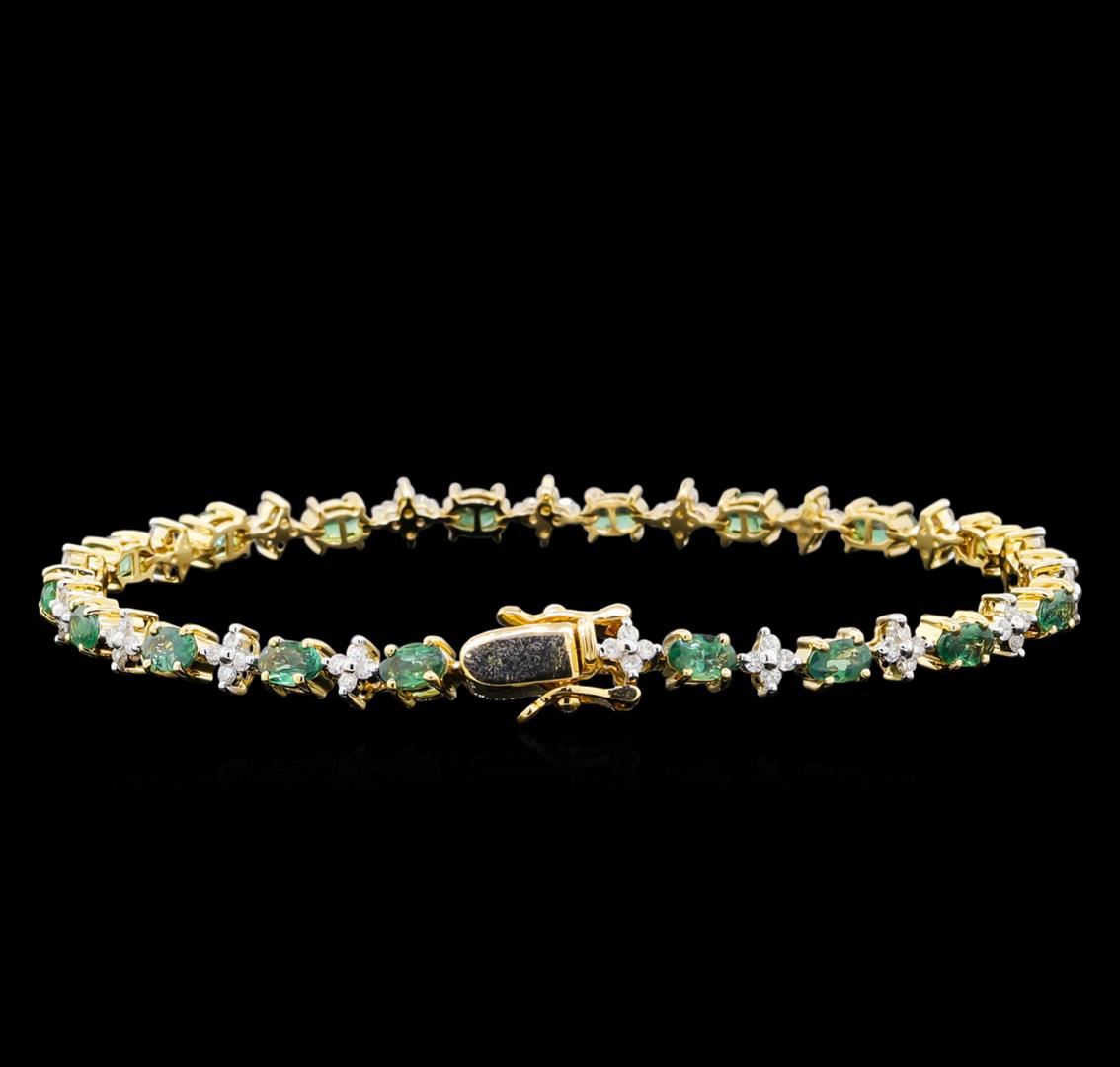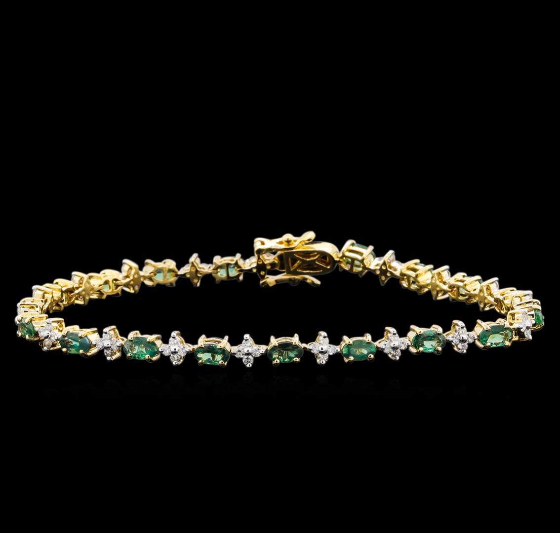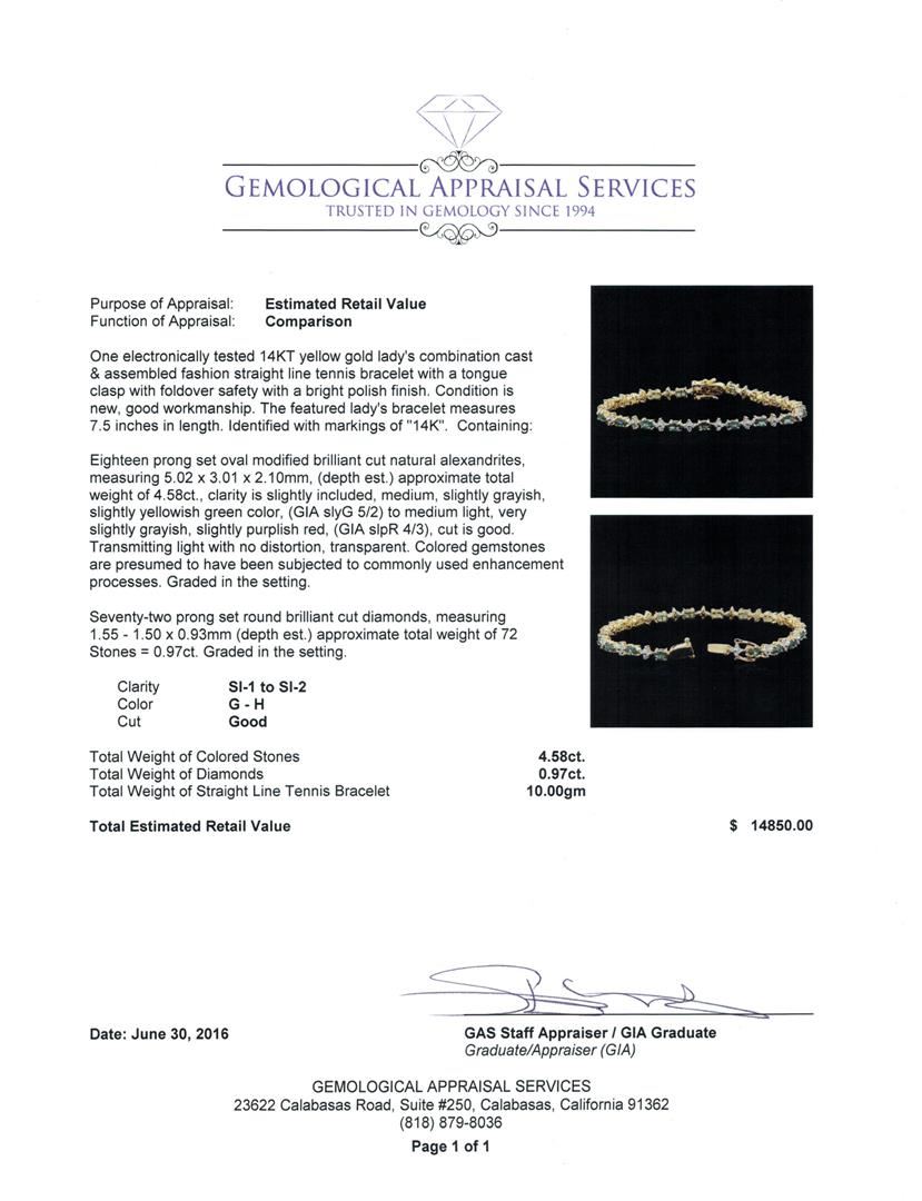 One electronically tested 14KT yellow gold lady's combination cast & assembled fashion straight line tennis bracelet with a tongue clasp with foldover safety with a bright polish finish. The featured lady's bracelet measures 7.5 inches in length. Identified with markings of "14K". Condition is new, good workmanship. Containing: Eighteen prong set oval modified brilliant cut natural alexandrites, measuring 5.02 x 3.01 x 2.10mm, (depth est.) approximate total weight of 4.58ct., clarity is slightly included, medium, slightly grayish, slightly yellowish green color, (GIA slyG 5/2) to medium light, very slightly grayish, slightly purplish red, (GIA slpR 4/3), cut is good. Transmitting light with no distortion, transparent. Colored gemstones are presumed to have been subjected to commonly used enhancement processes. Graded in the setting. Seventy-Two prong set round brilliant cut diamonds, measuring 1.55 - 1.50 x 0.93mm (depth est.) approximate total weight of 72 Stones = 0.97ct. Graded in the setting. Clarity: SI-1 to SI-2. Color: G - Good. Total Weight of Colored Stones 4.58ct. Total Weight of Diamonds 0.97ct. Total Weight of Straight Line Tennis Bracelet 10.00gm. GAS Appraised at $14,850.00.